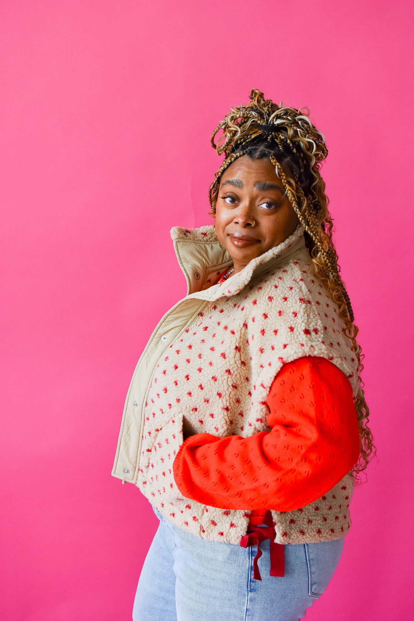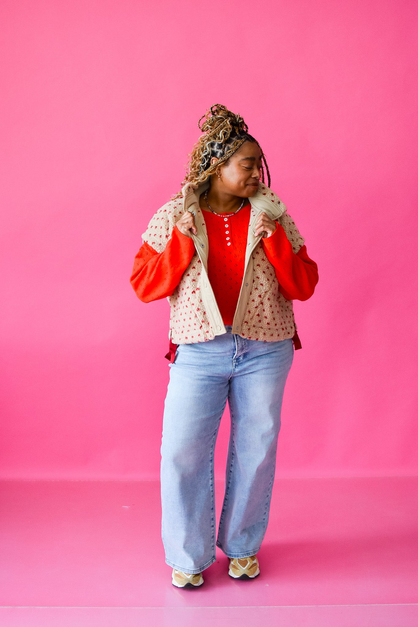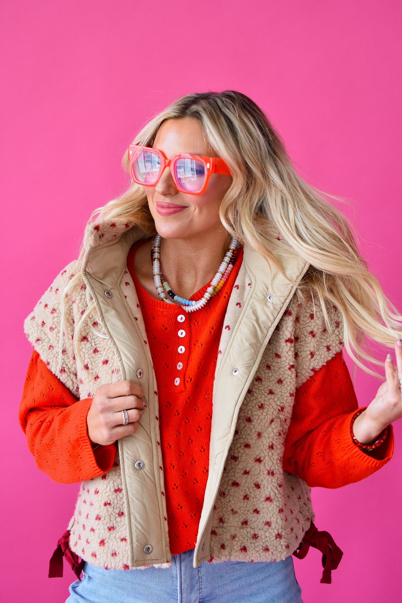 Layer up with the Wendy Polka Dot Sherpa Vest, your new go-to for cozy-chic vibes. This oversized taupe sherpa features charming red polka dots and a button-up front for easy styling. Adjustable side ties let you cinch the fit to your preference, making it perfect for everything from casual coffee runs to weekend adventures. Soft, warm, and undeniably cute—the ultimate throw-on piece for any season.