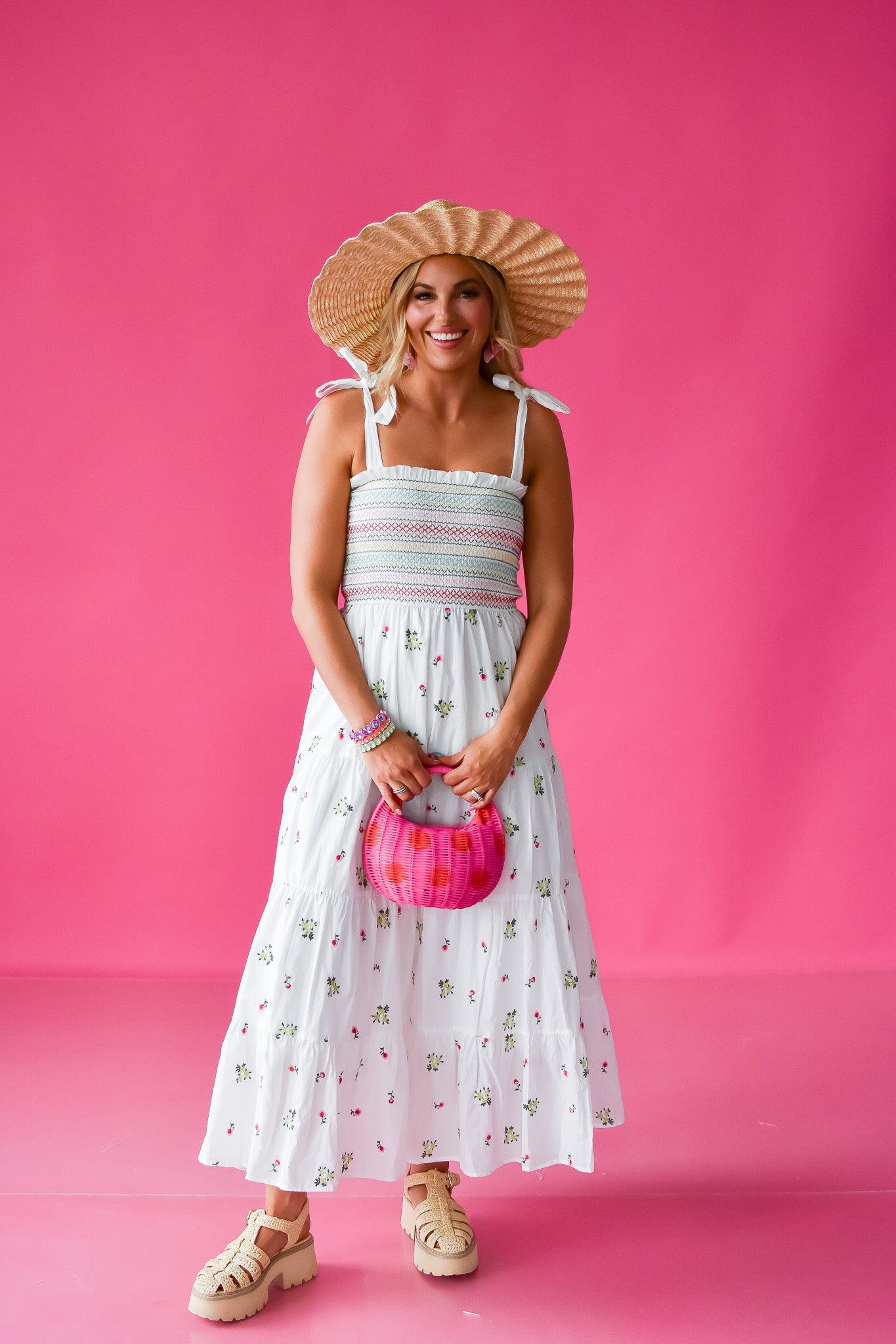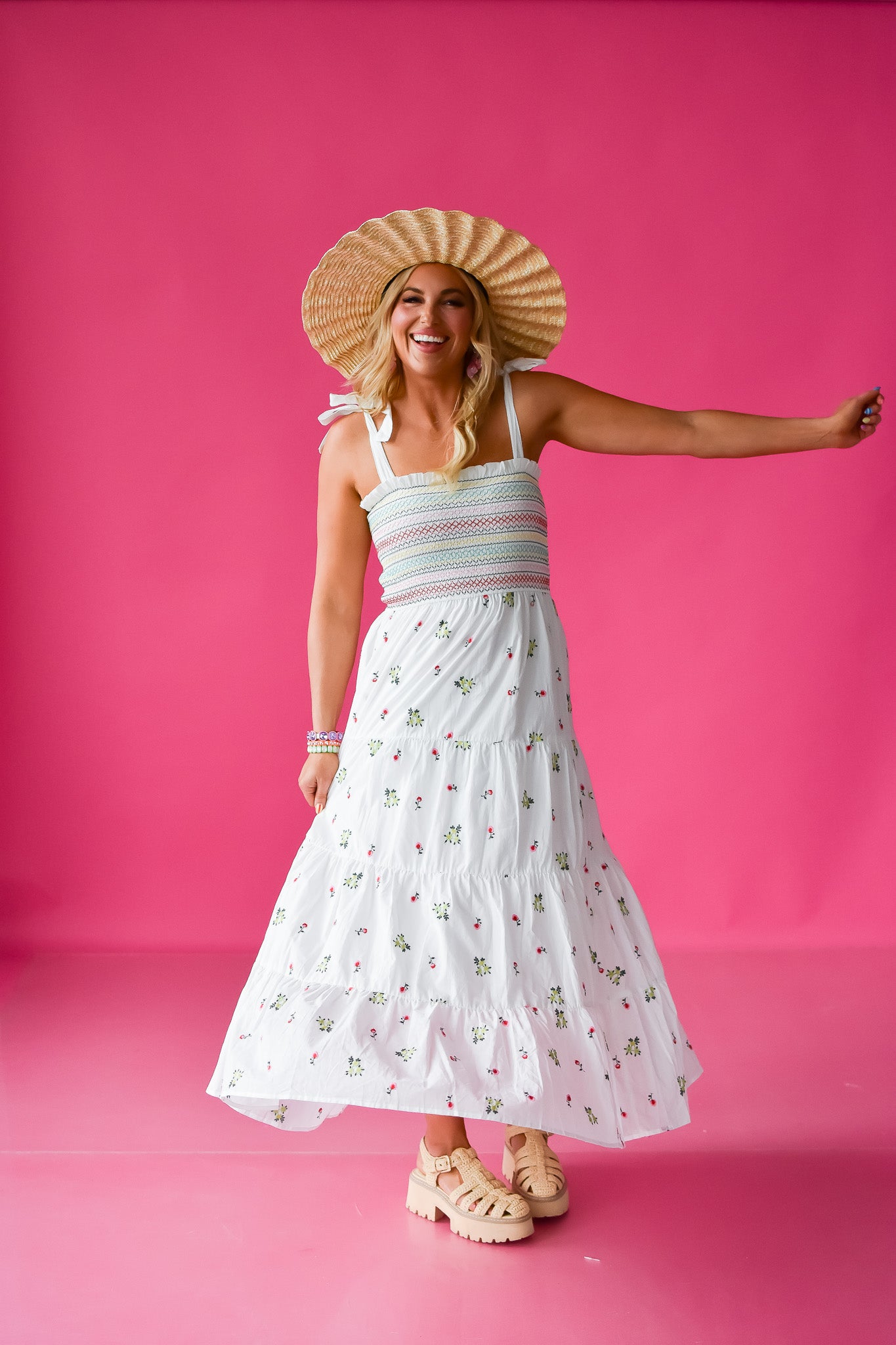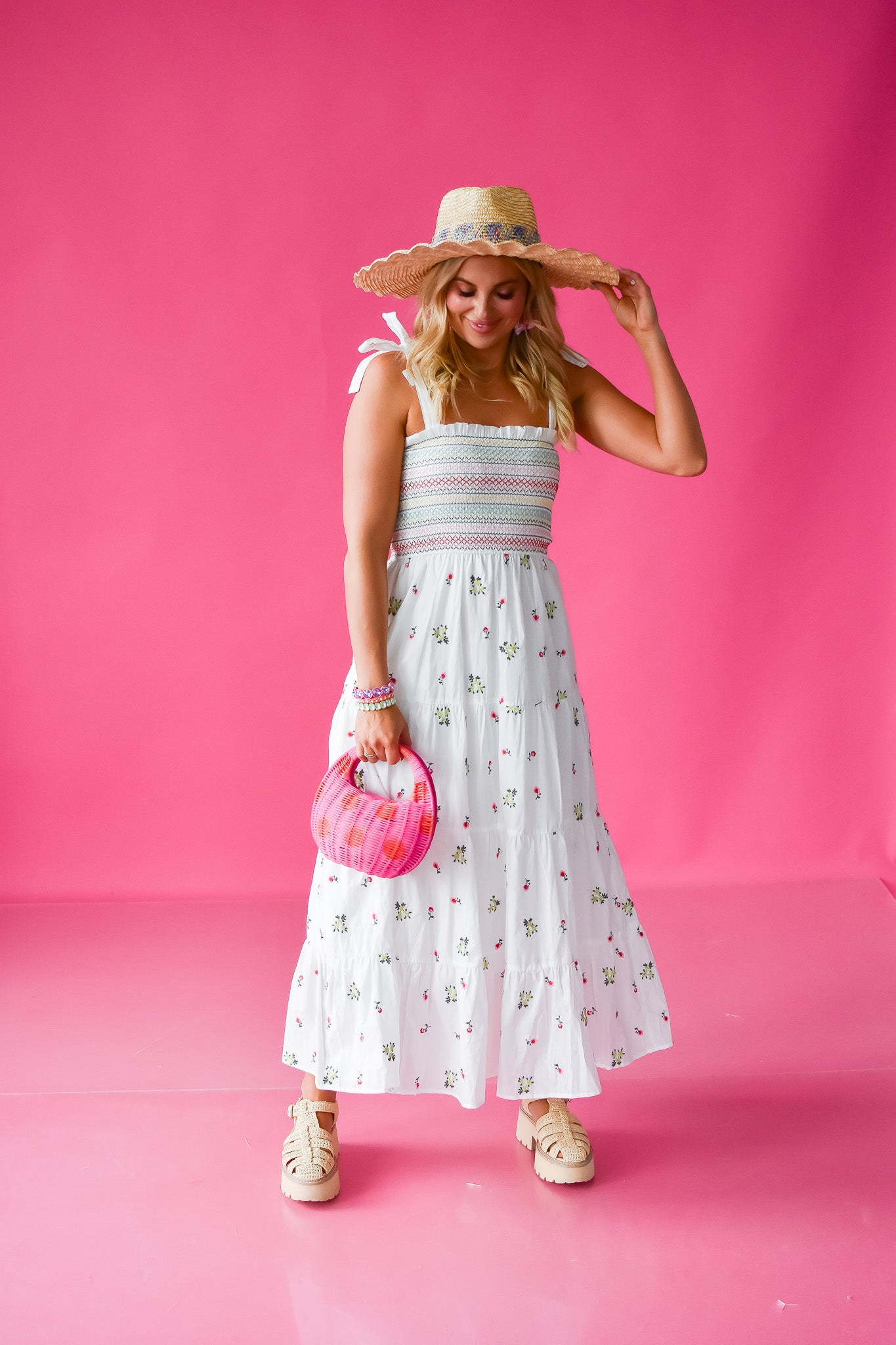 Step into your next special event with the Betsy Floral Maxi Dress, featuring a stunning white smocked bust and vibrant multi-colored embroidered flowers. This playful dress combines comfort and style with adjustable ties for the perfect fit, making every moment feel effortlessly beautiful.