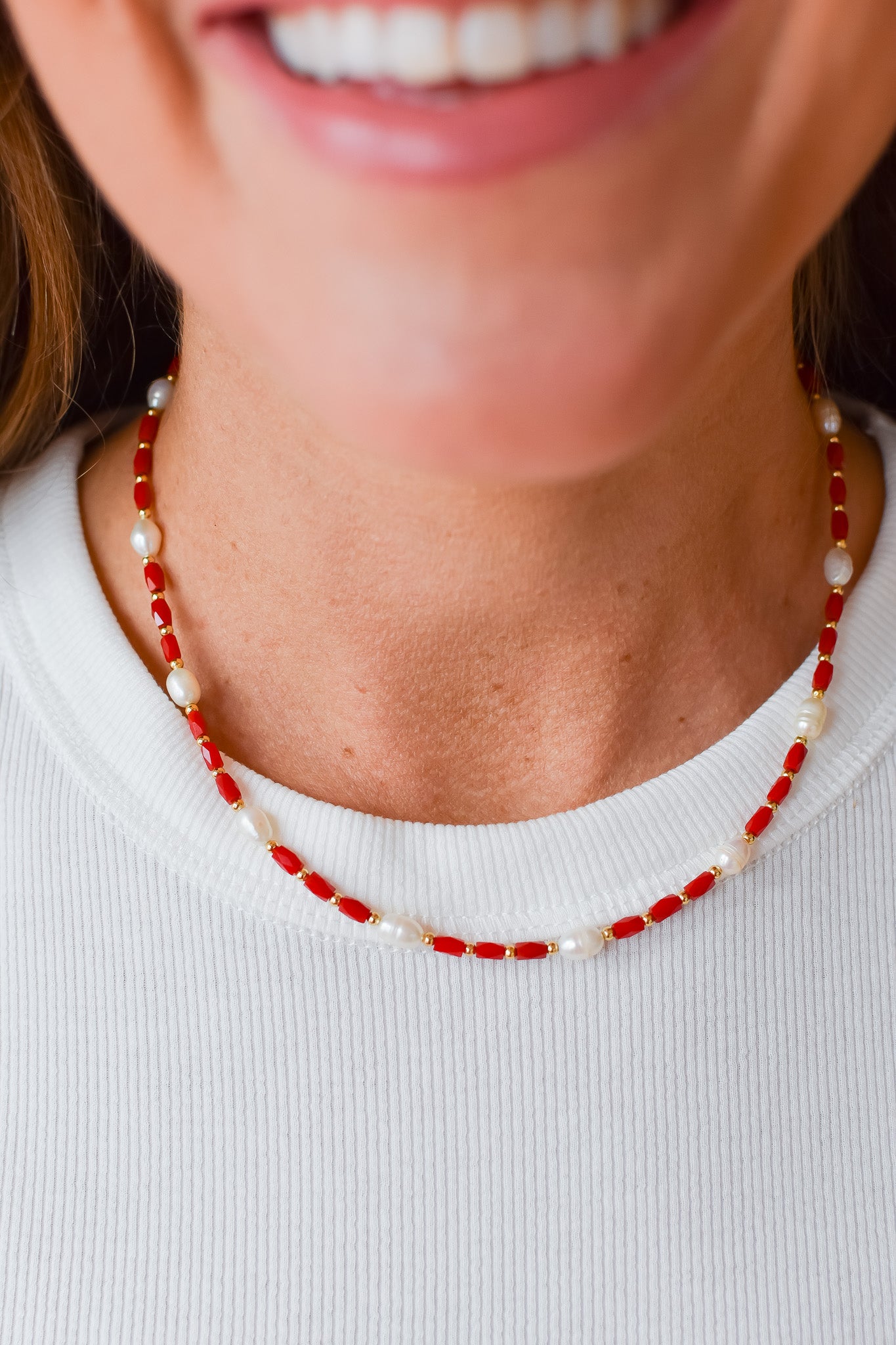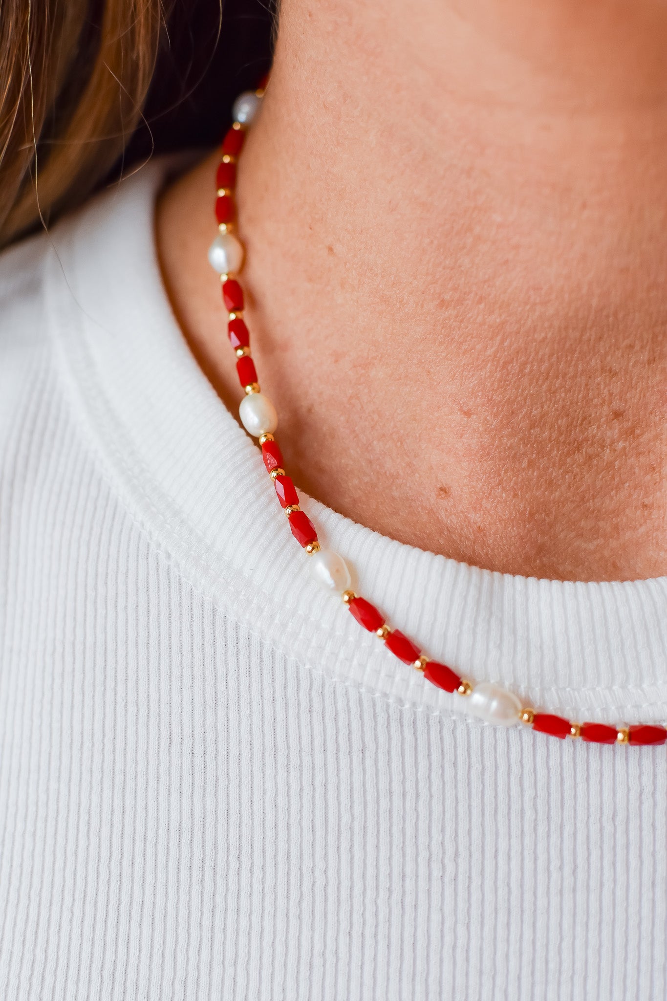 Make a bold statement with the Bead Chic Necklace in red. This playful mix of vibrant red beads and classic pearls adds a fun twist to any look, perfect for adding a pop of color and charm to your day.