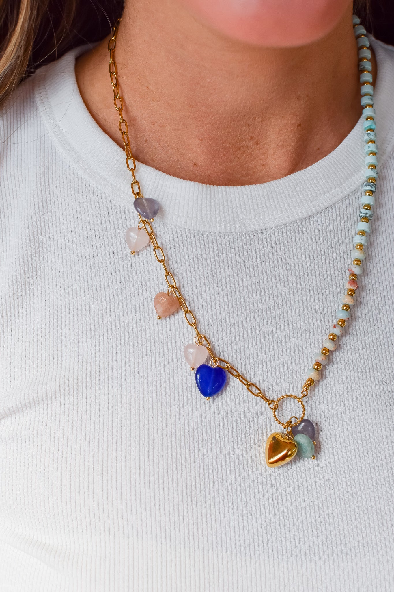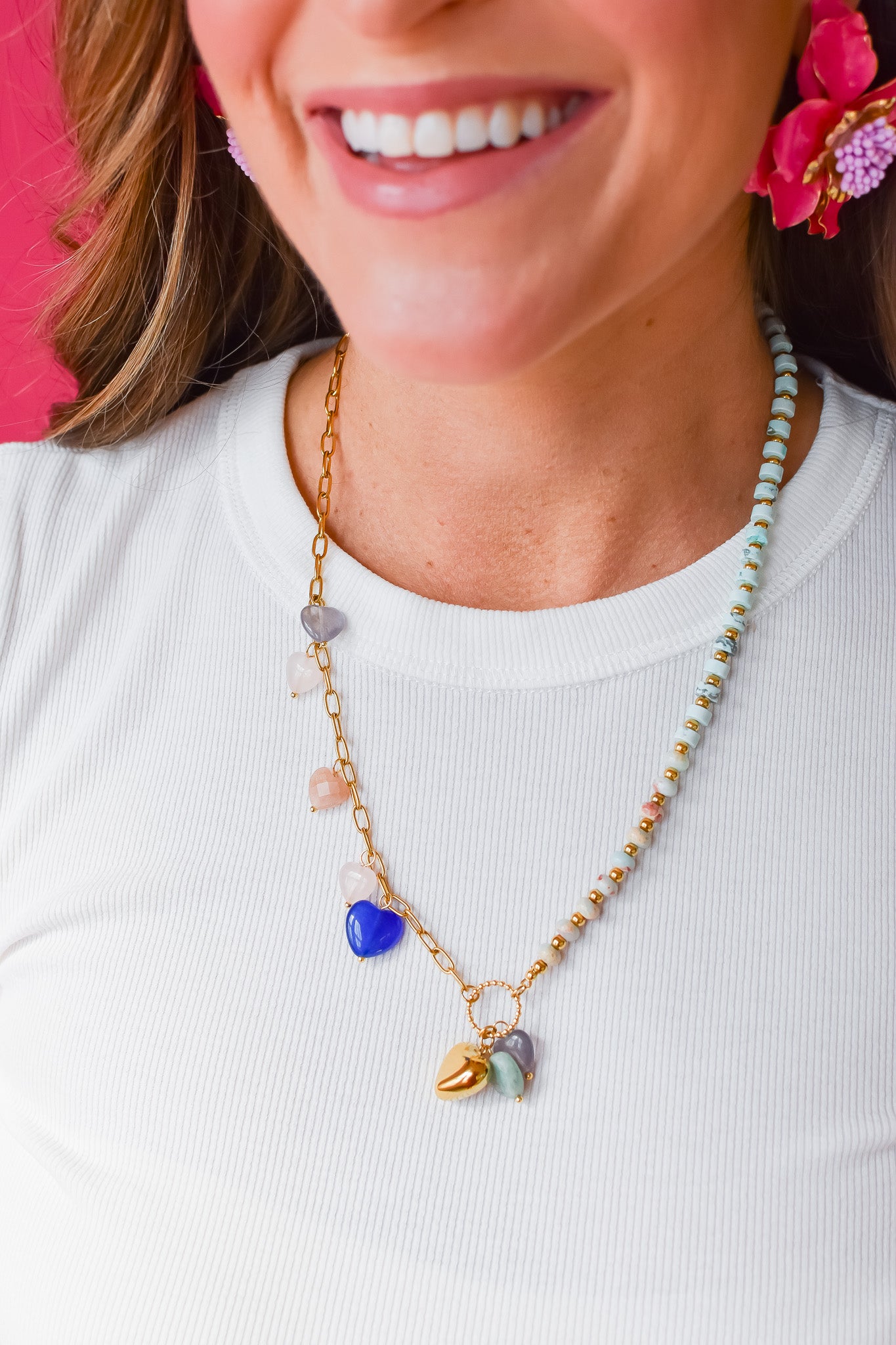 Brighten your day with the In My Dreams Beaded Necklace. Featuring a gold chain adorned with playful multi-colored heart charms, its longer length adds a fun, flirty vibe to any outfit. Perfect for layering or wearing on its own, this necklace brings a cheerful pop of color wherever you go.