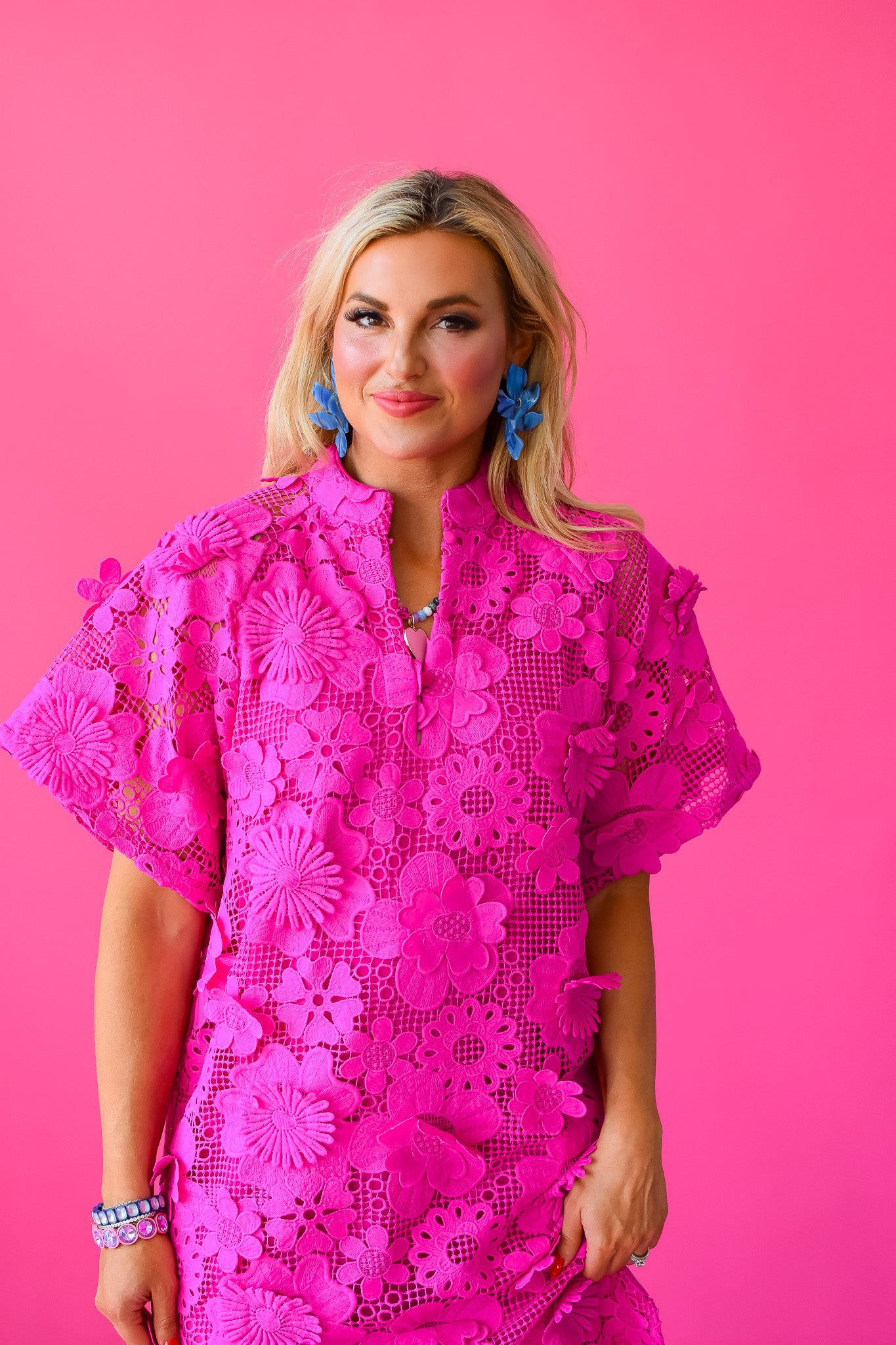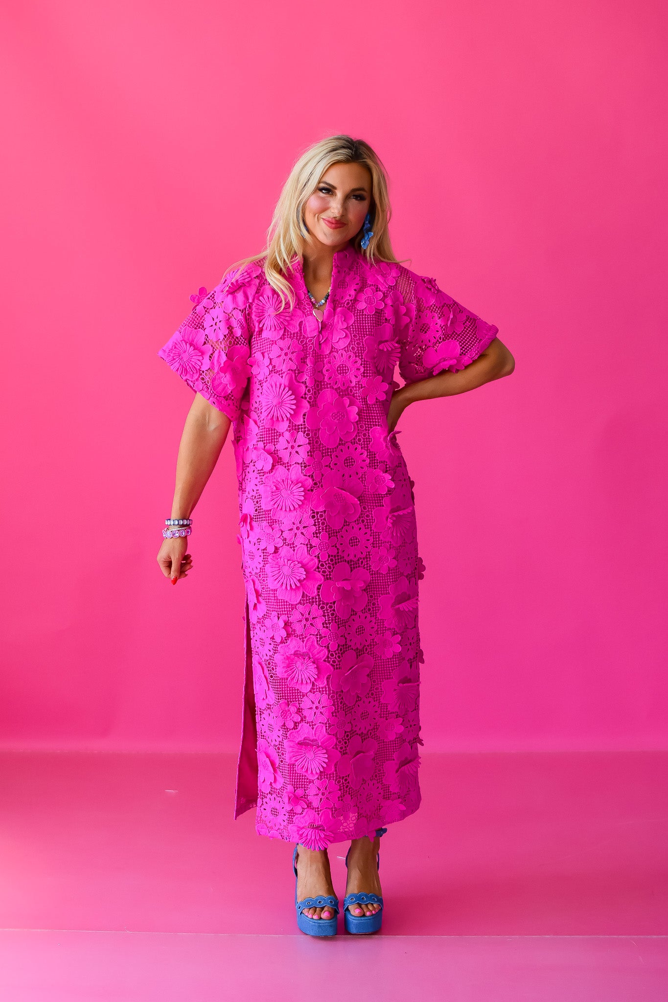 Step into summer with the Leighton Maxi Dress, a playful blend of elegance and ease. This gorgeous pink caftan-style dress features charming 3D floral details and breezy short sleeves. With side slits that add a flirty twist, it’s perfect for twirling, strolling, or just soaking up the sunshine in style.