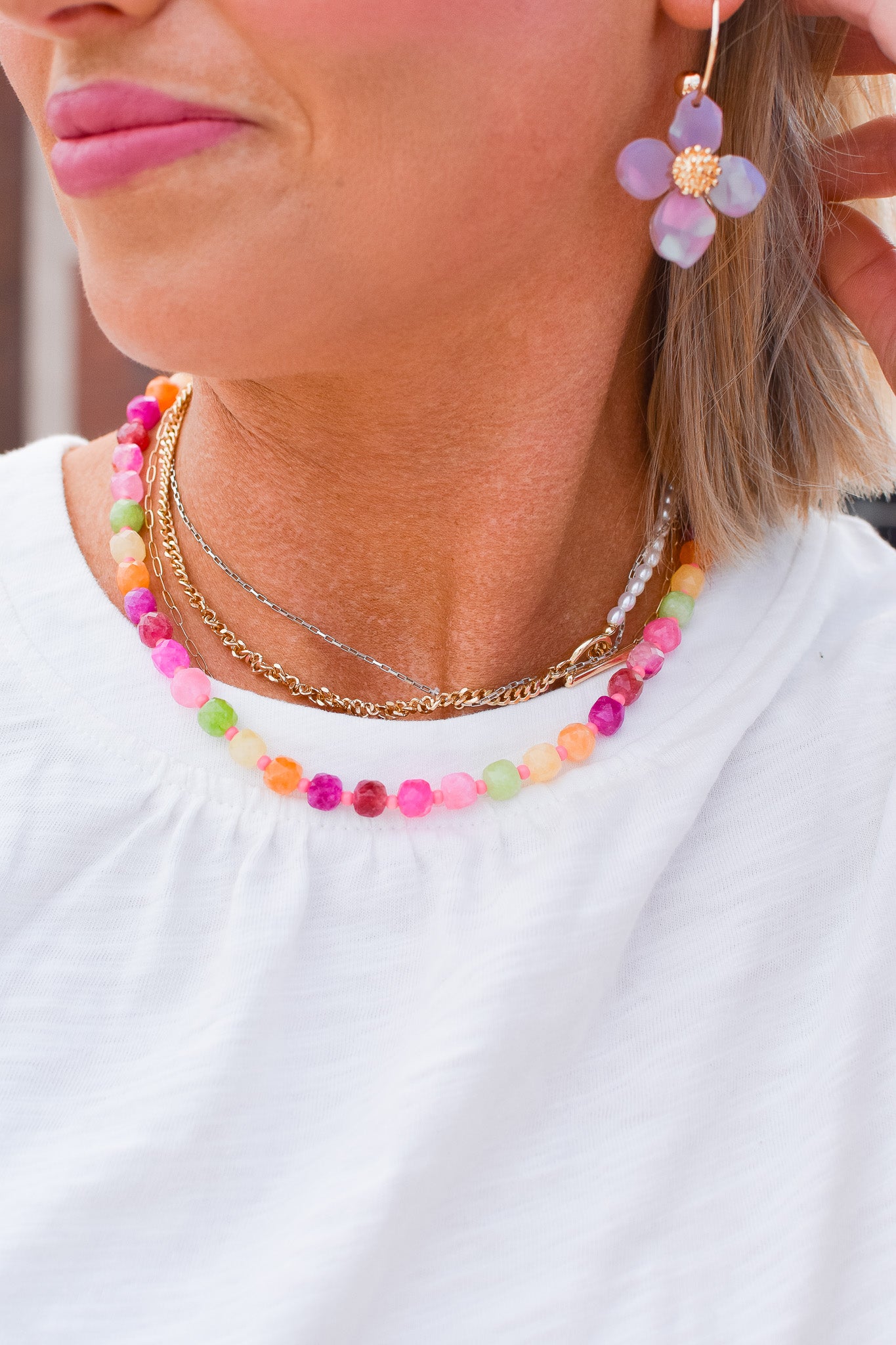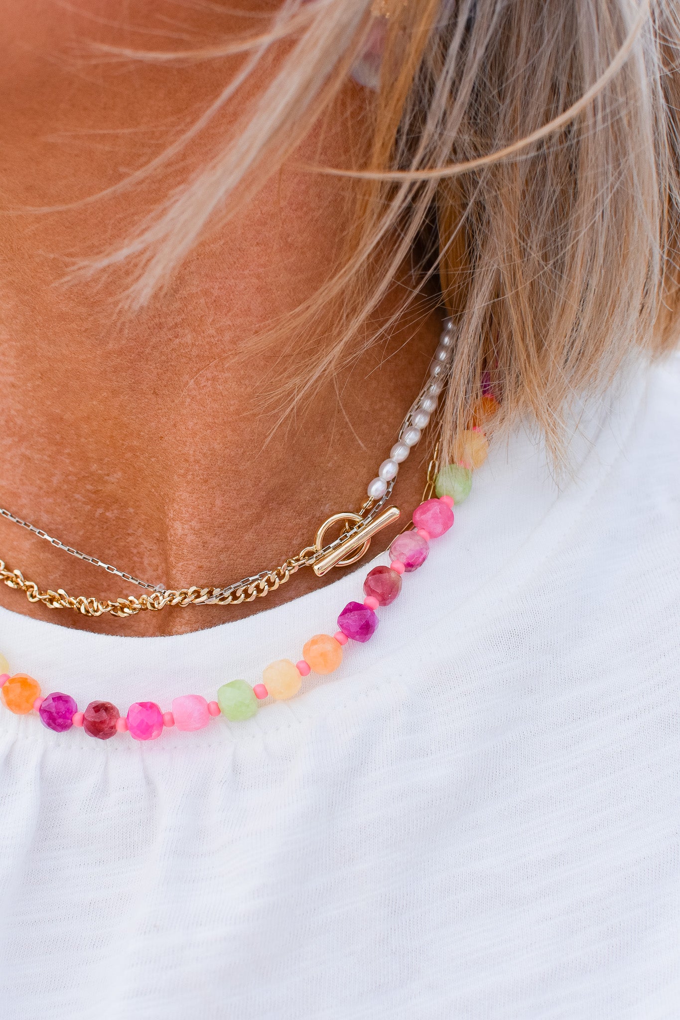 Add a vibrant pop of color to any outfit with our Rainbow Necklace Luxe! Featuring vibrant gemstones in pink and coral hues, this playful and stylish necklace is a best seller with five stars. Stand out and make others envious with this fun and trendy piece.