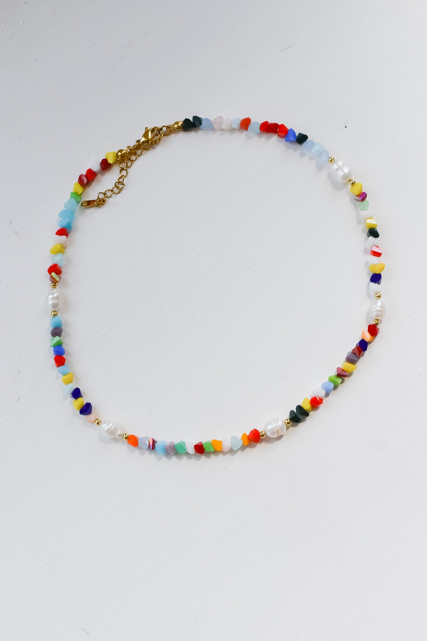 Add some whimsy to your outfit with our Sea Glass Pearls Beaded Necklace! Featuring a colorful mix of mismatched beads and elegant pearls in shades of red, blue, yellow, black, green, and orange. Perfect for making a unique statement.