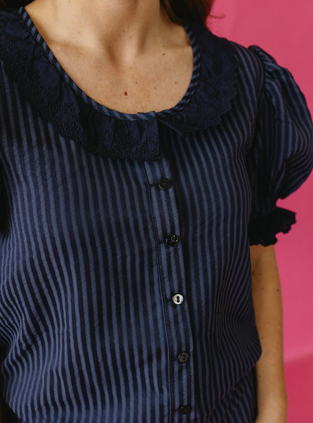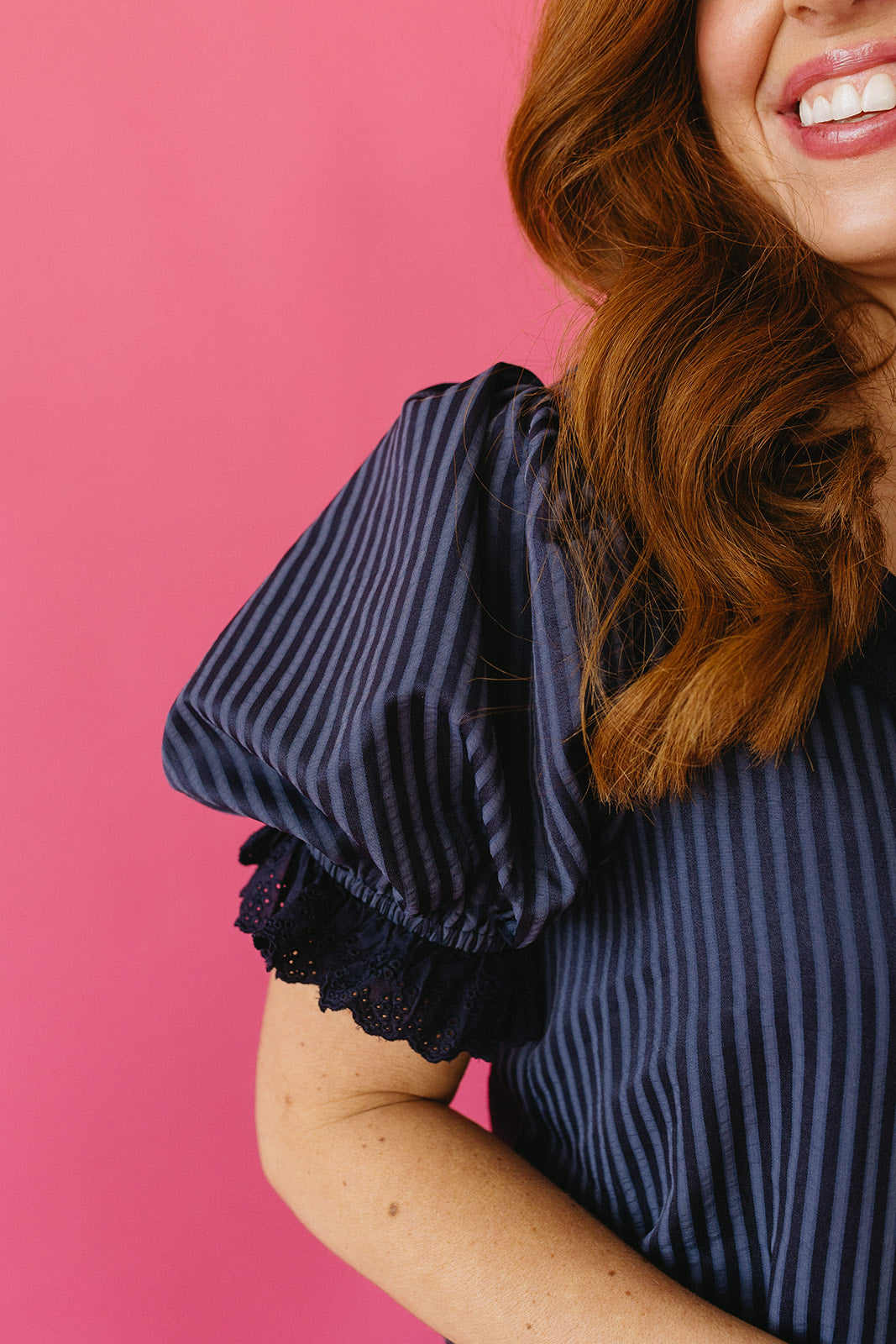 Meet the Jaden Pinstripe Lace Top—your new go-to for effortless office style with a dash of charm. Crafted in crisp navy pinstripe, this top features an elegant lace collar and lace-trimmed sleeves that bring personality to your professional look. Gentle puff sleeves add dimension, while functional buttons keep things practical and put-together. Pro tip: pair it with the matching Jaden Pinstripe Pant (sold separately) to complete the coordinated set. Work-appropriate never looked this fun.
