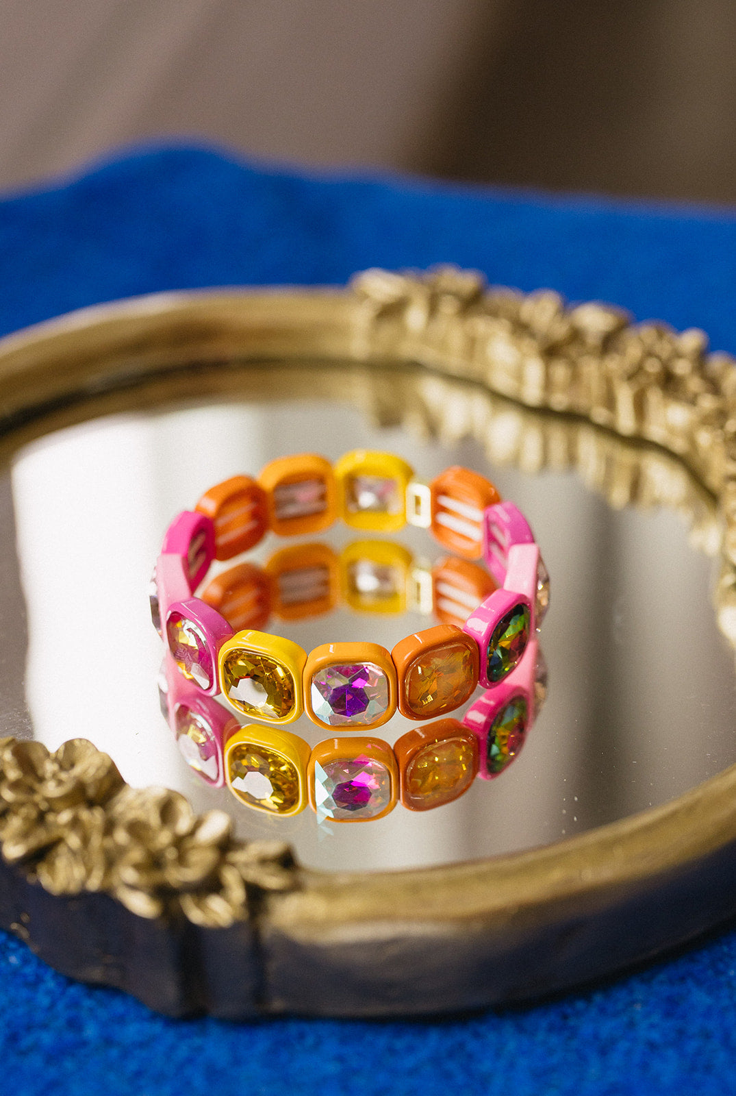 The Elise bracelet brings a burst of color to your wrist with its charming blend of soft pink tones and subtle gray accents. Perfect for stacking or wearing solo.