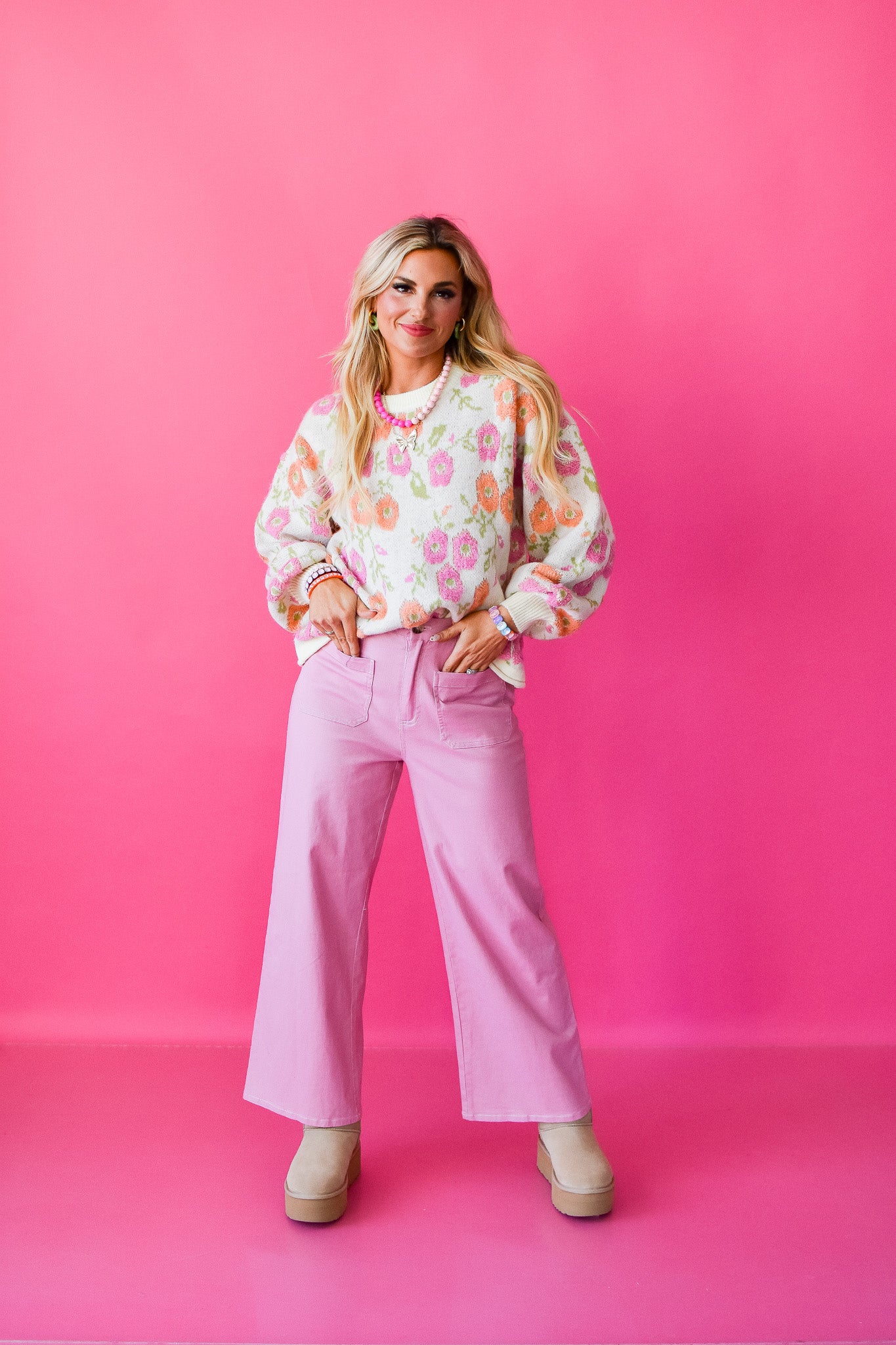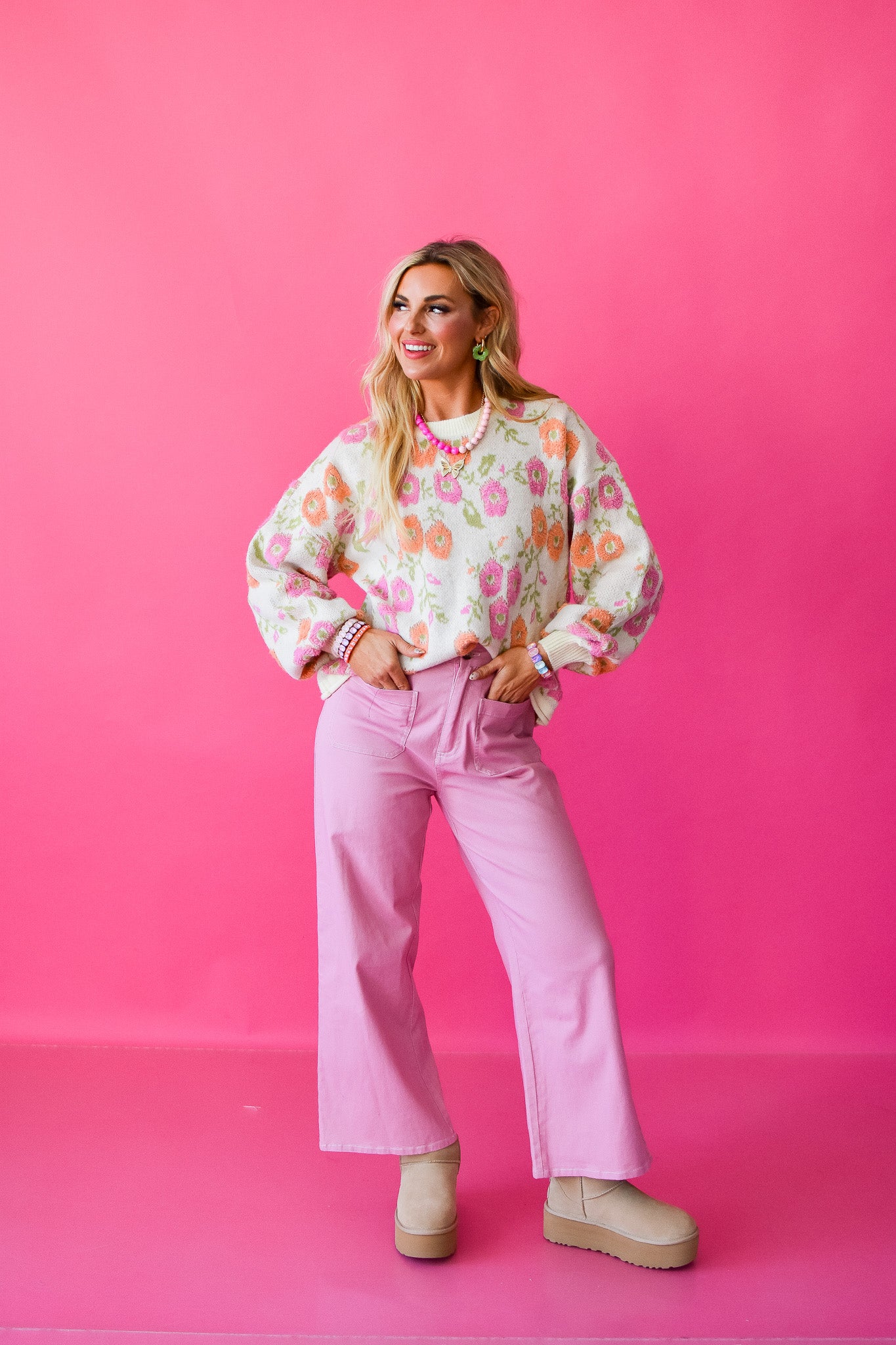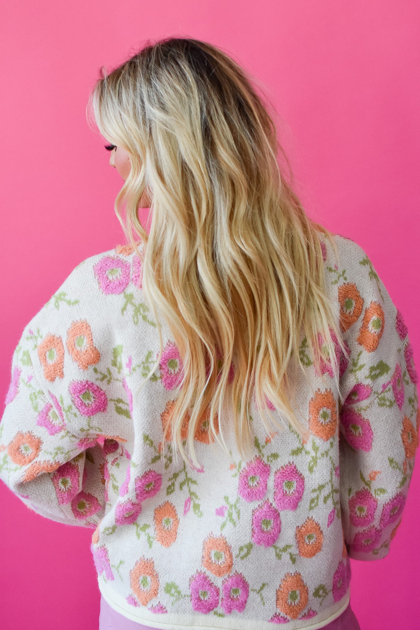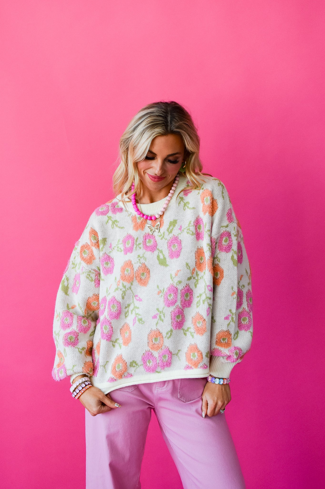 Brighten your wardrobe with the Parker Floral Sweater, a cheerful blend of pink and orange blooms that brings instant joy to any outfit. This cozy knit features a vibrant floral pattern that captures the essence of a spring garden, perfect for layering over your favorite tee or wearing solo. Whether you're heading to brunch or a casual weekend hangout, this sweater adds a pop of color and personality to your everyday style. Soft, comfortable, and undeniably charming—your new go-to piece awaits!