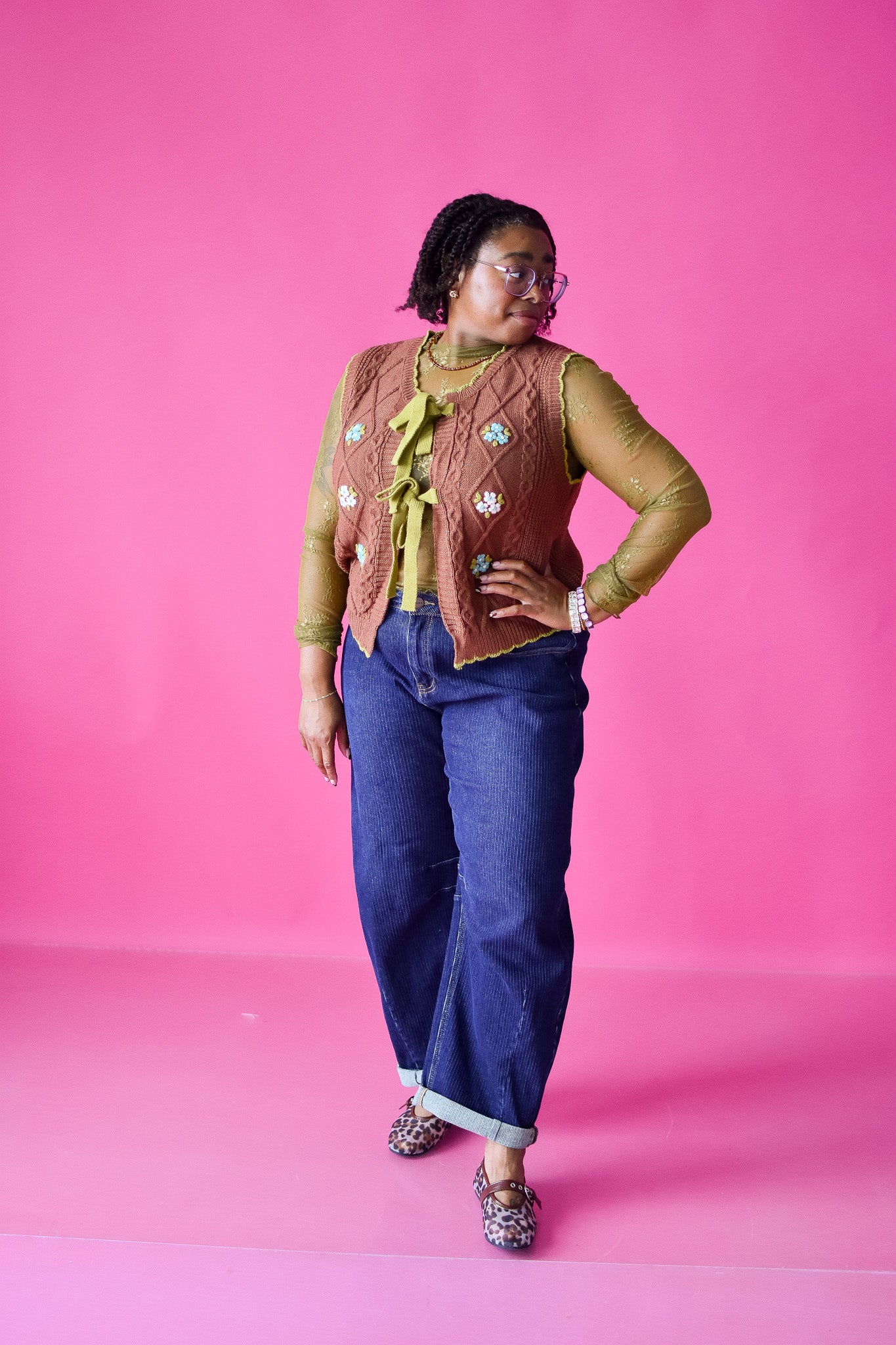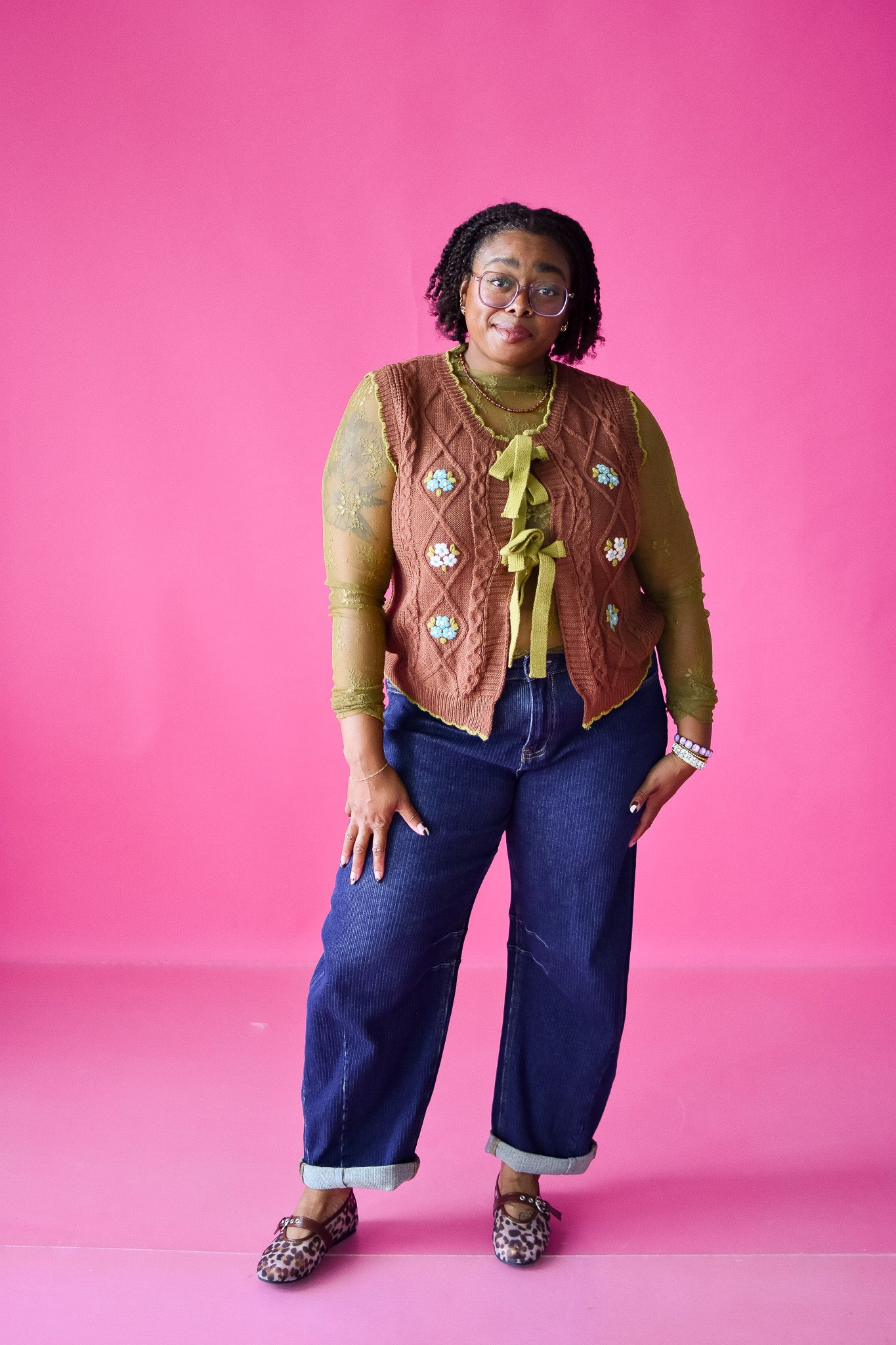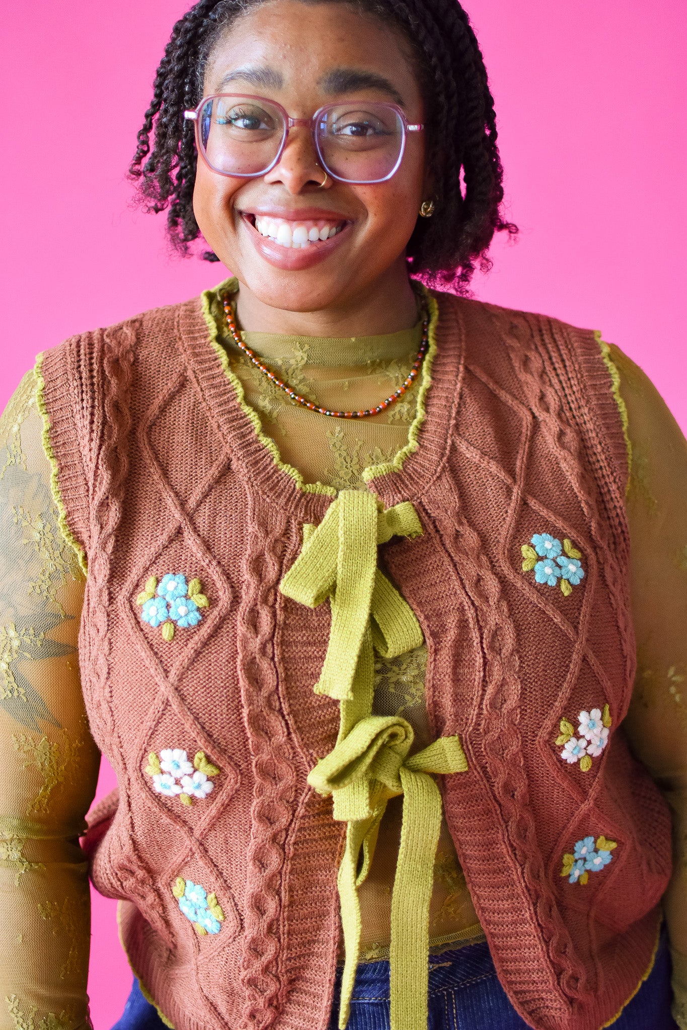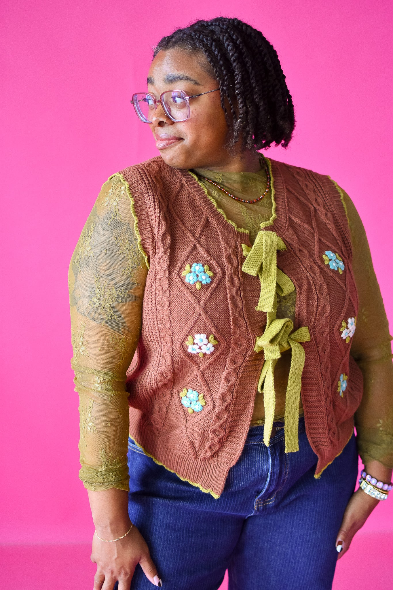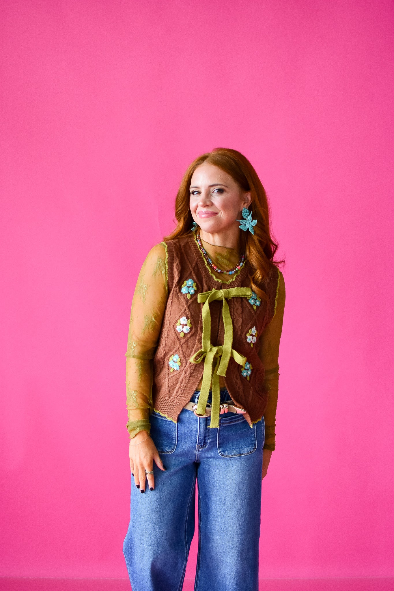Brighten your wardrobe with the Claudia Sweater Vest, a delightful chocolate brown knit featuring charming chartreuse and turquoise floral accents. The playful scallop hem adds a whimsical edge, while the bow tie detail at the bust brings a flirty, feminine touch. Perfect for layering or making a statement on its own, this vest combines cozy comfort with eye-catching style.