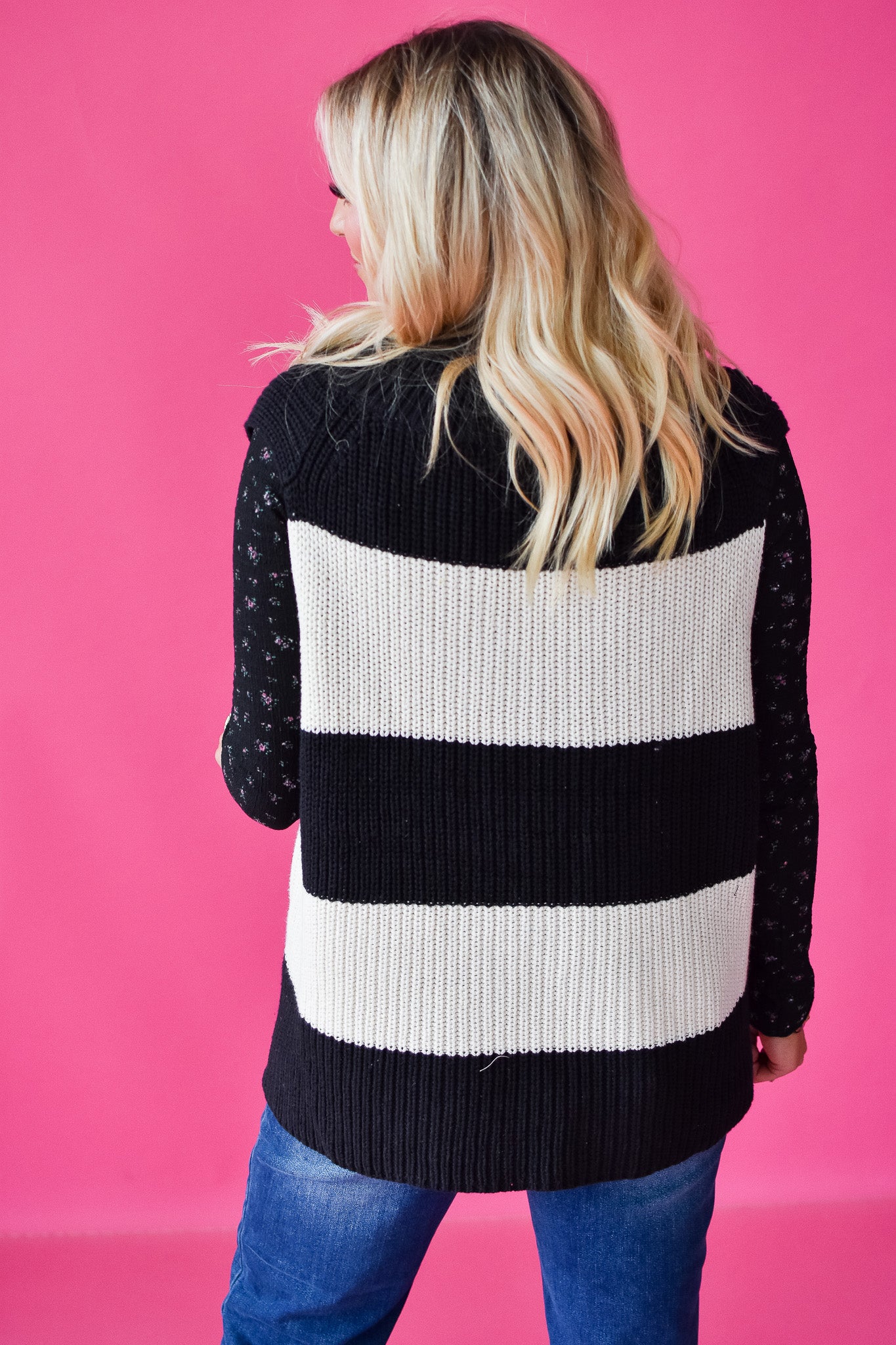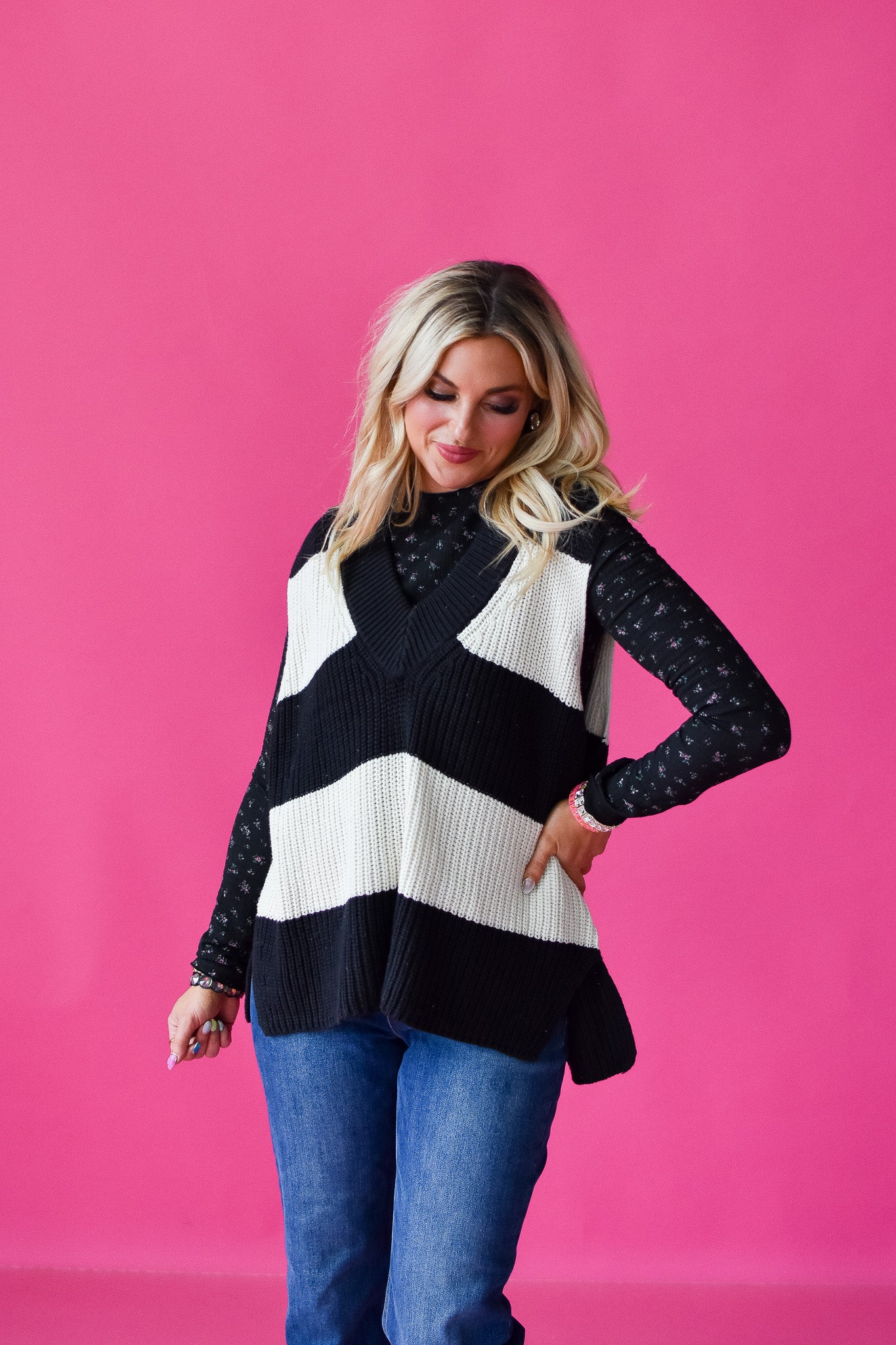 Cozy up in the Jill Stripe Sweater Vest, a playful oversized piece featuring a black and cream chunky knit with a trendy V-neck. Perfect to wear solo or layered over your favorite tee or delicate lace top, it adds effortless cool and warmth to any outfit. Embrace the cozy-chic vibe with this versatile wardrobe essential!