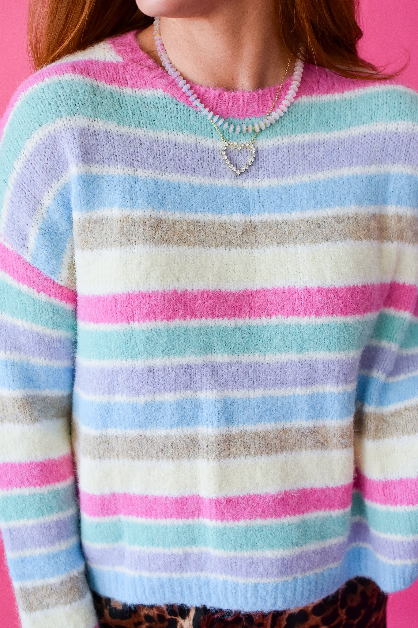 Wrap yourself in soft, dreamy stripes with the Claire Pastel Striped Sweater. This brushed knit beauty features gentle pastel hues blended into a cheerful multi-stripe pattern that's perfect for adding a pop of color to your everyday rotation. The cozy texture and relaxed fit make it an instant favorite for layering or wearing solo. Whether you're heading to brunch or settling in for a cozy night, this sweater brings effortless charm and comfort to any outfit.