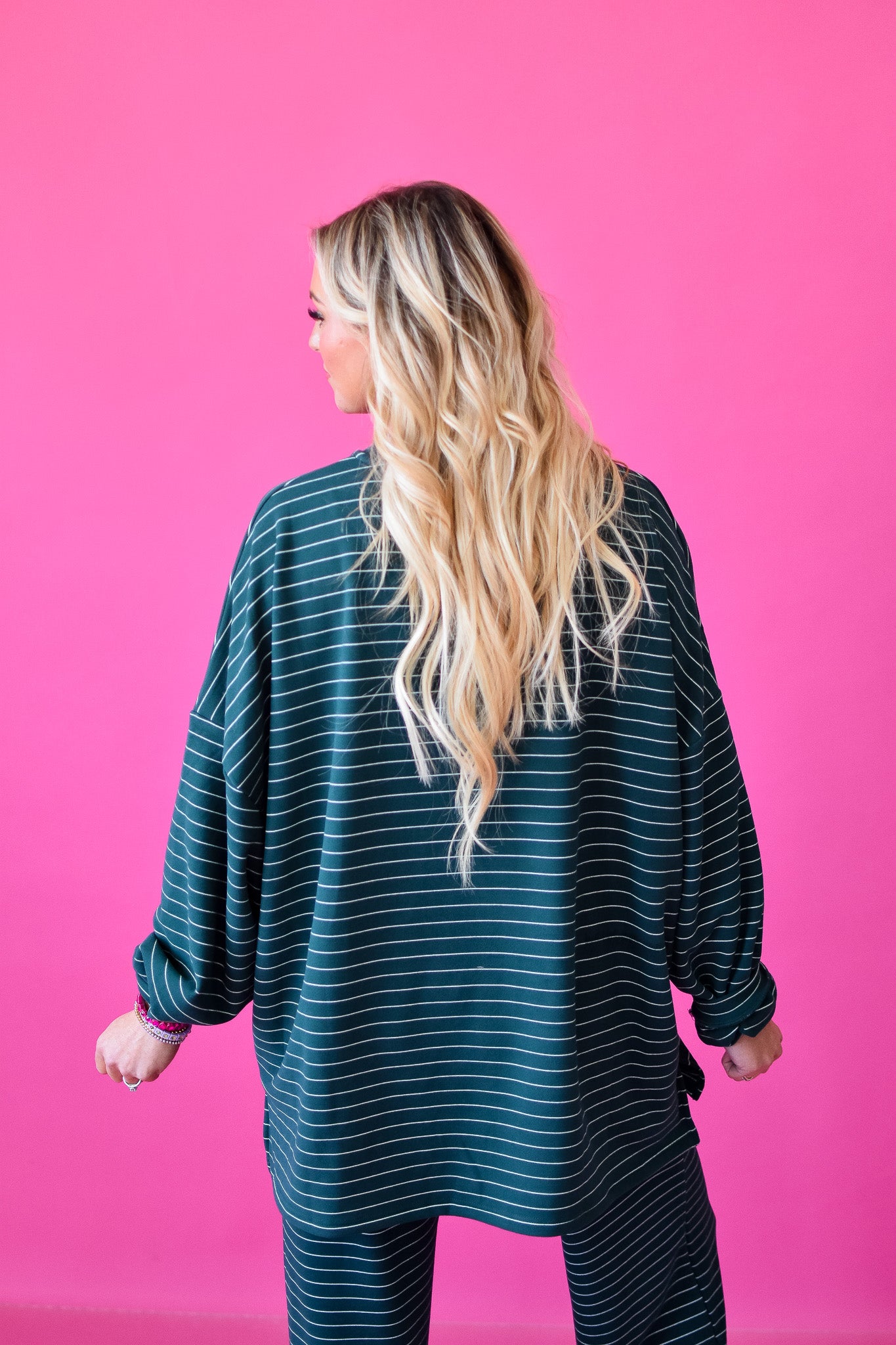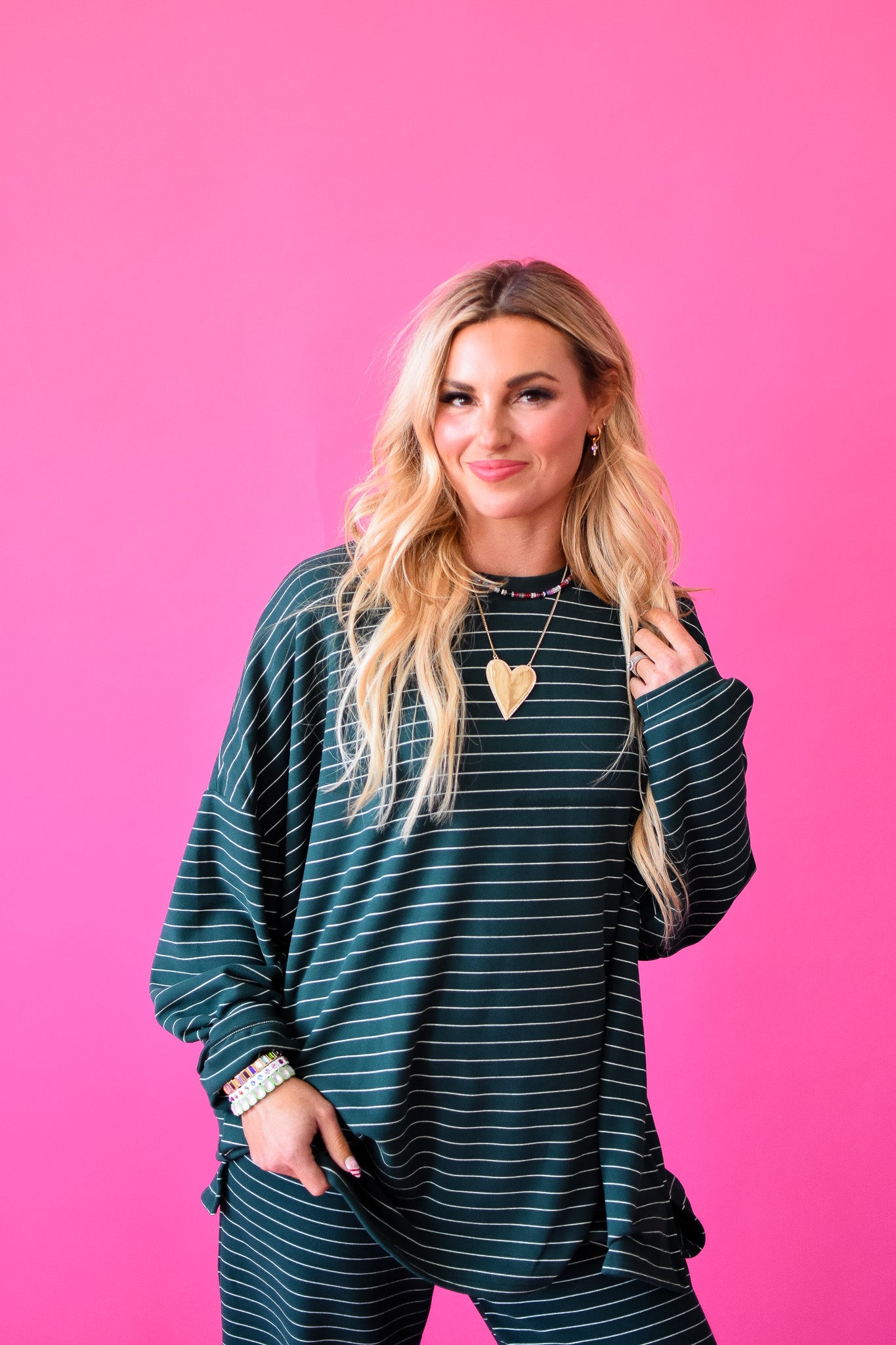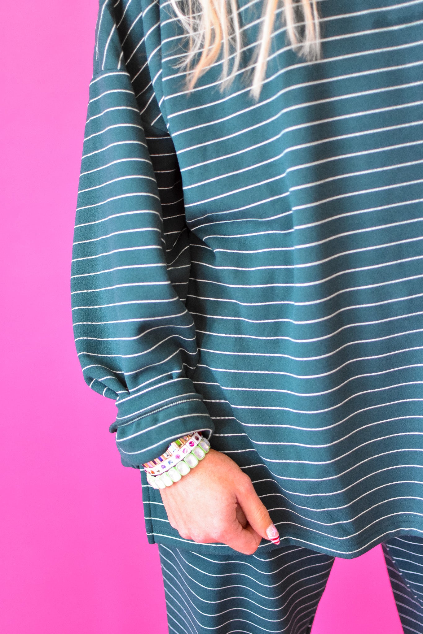 Be bold and make a statement with the Nyah Striped Tunic Top. This oversized and cozy tunic features a stylish split hem, perfect for layering with jackets or vests. The eye-catching emerald green and white stripes add a pop of color to any outfit. So go ahead, add some flare to your wardrobe with this must-have top!