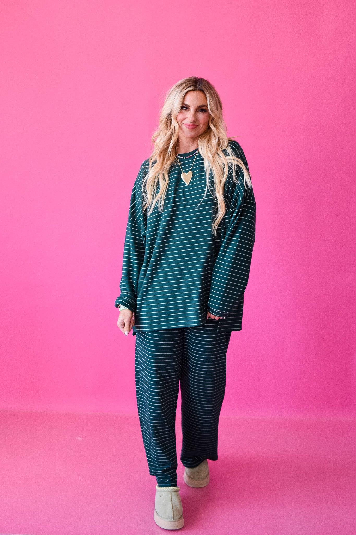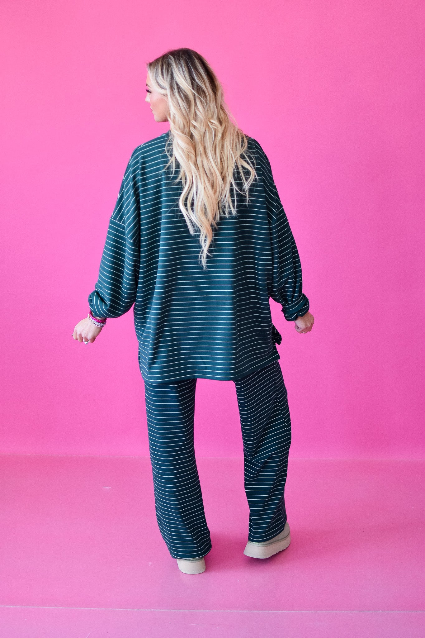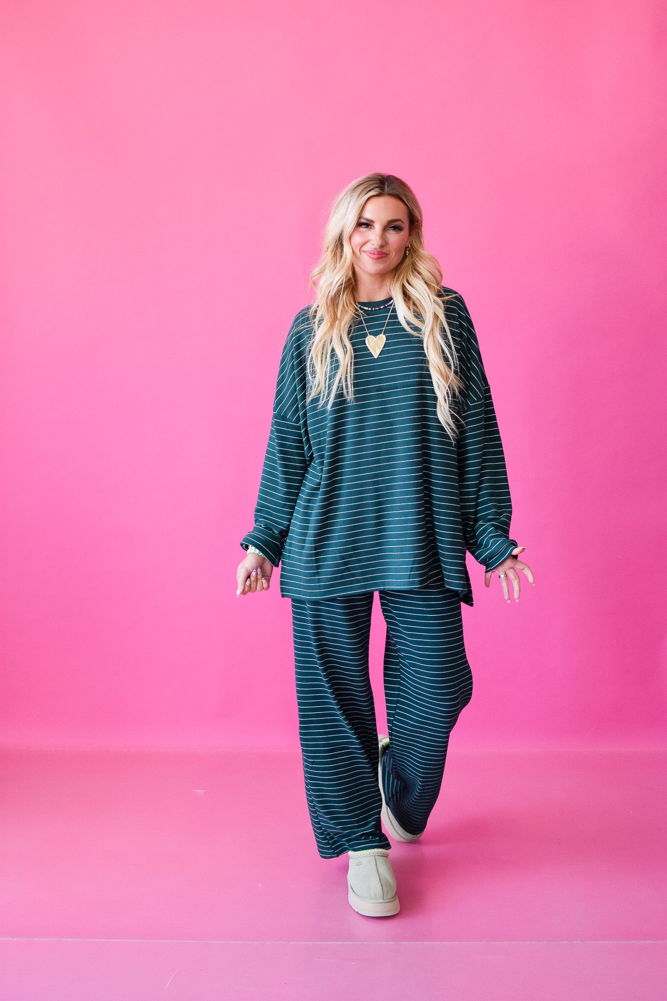 Be bold and make a statement with the Nyah Striped Tunic Top. This oversized and cozy tunic features a stylish split hem, perfect for layering with jackets or vests. The eye-catching emerald green and white stripes add a pop of color to any outfit. So go ahead, add some flare to your wardrobe with this must-have top!