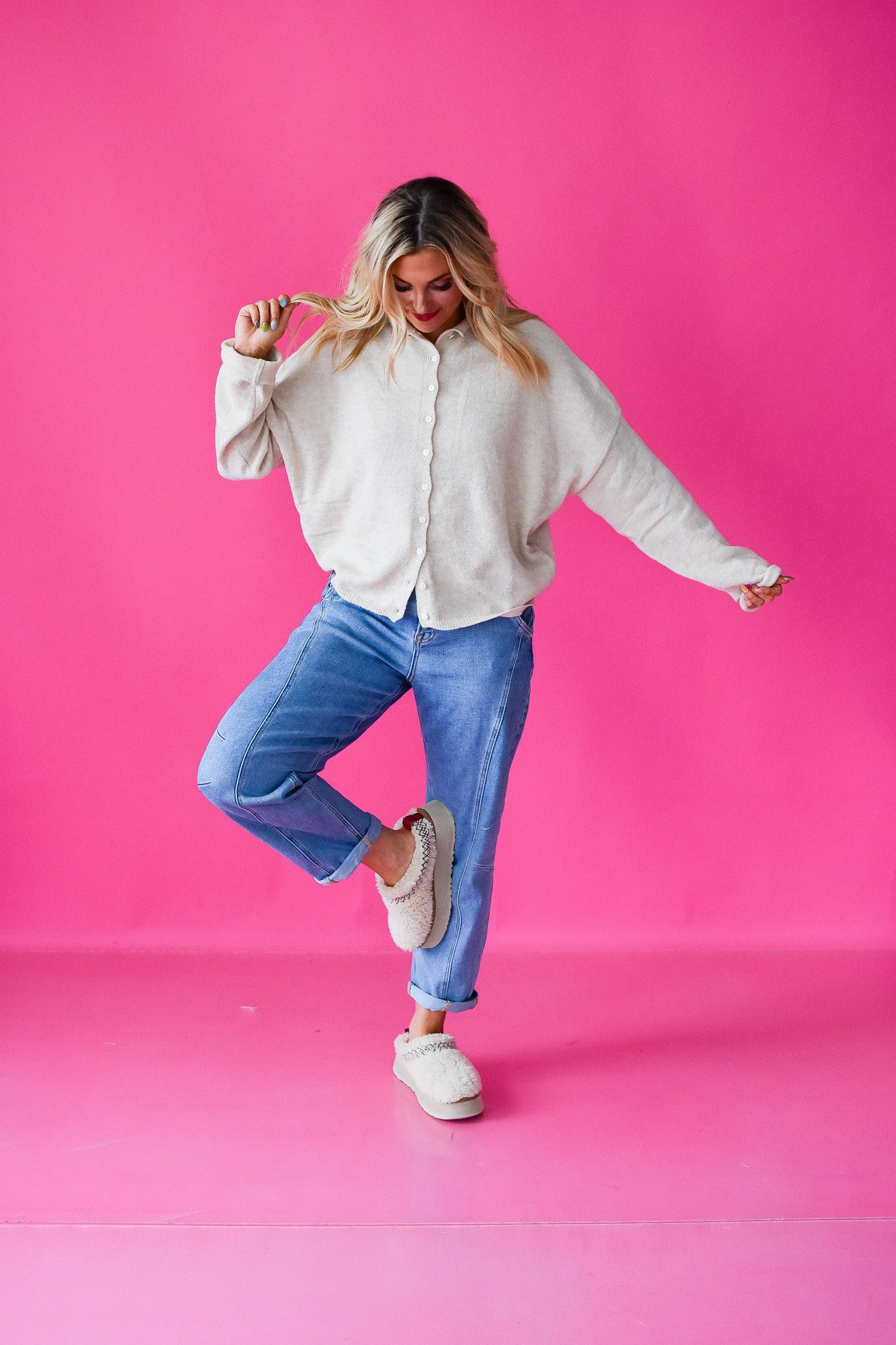 Get ready to go viral in our playful Piper Cardigan! This natural button up cardigan features super soft fabric, white buttons and an oversized, relaxed fit for maximum comfort and style.