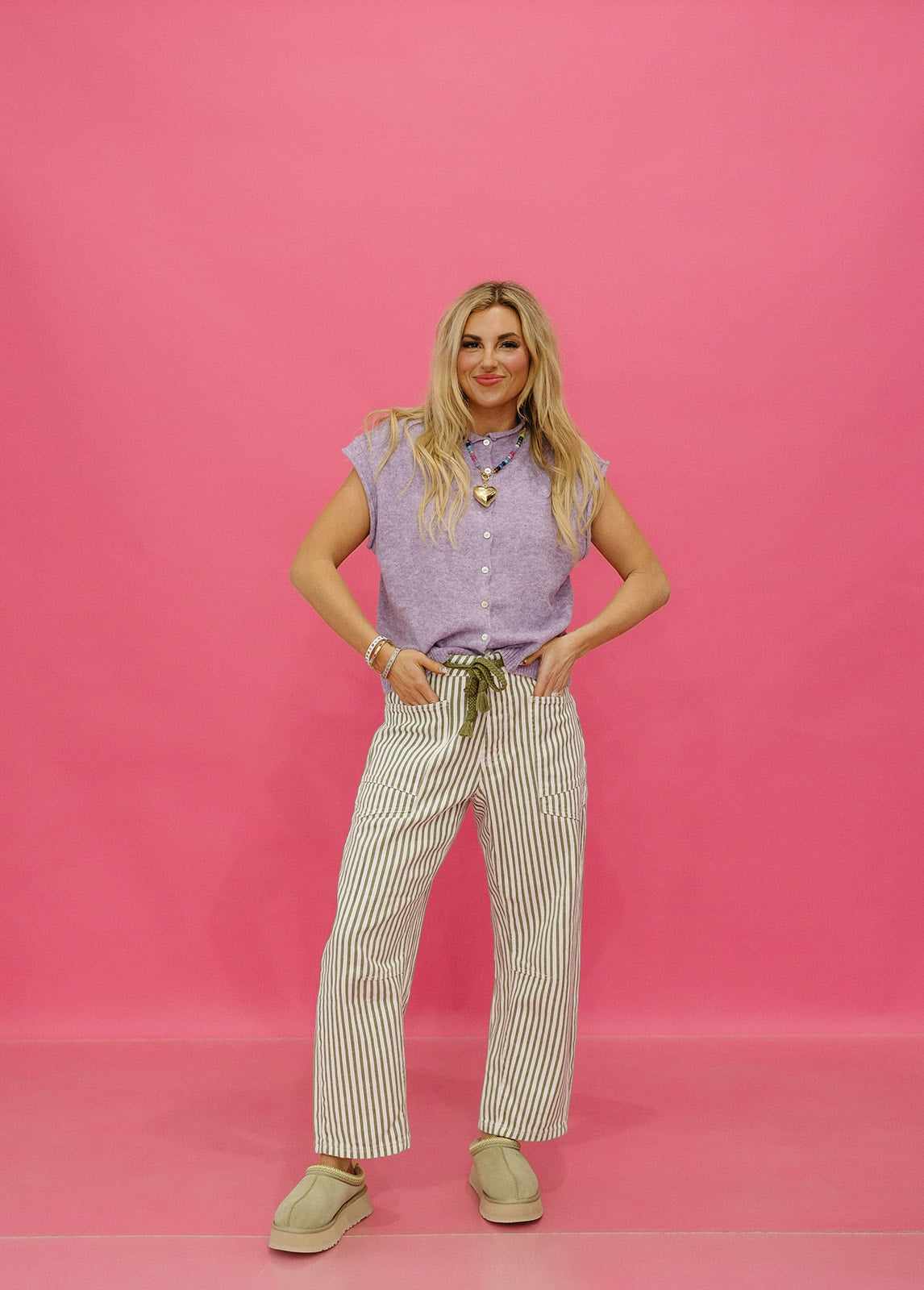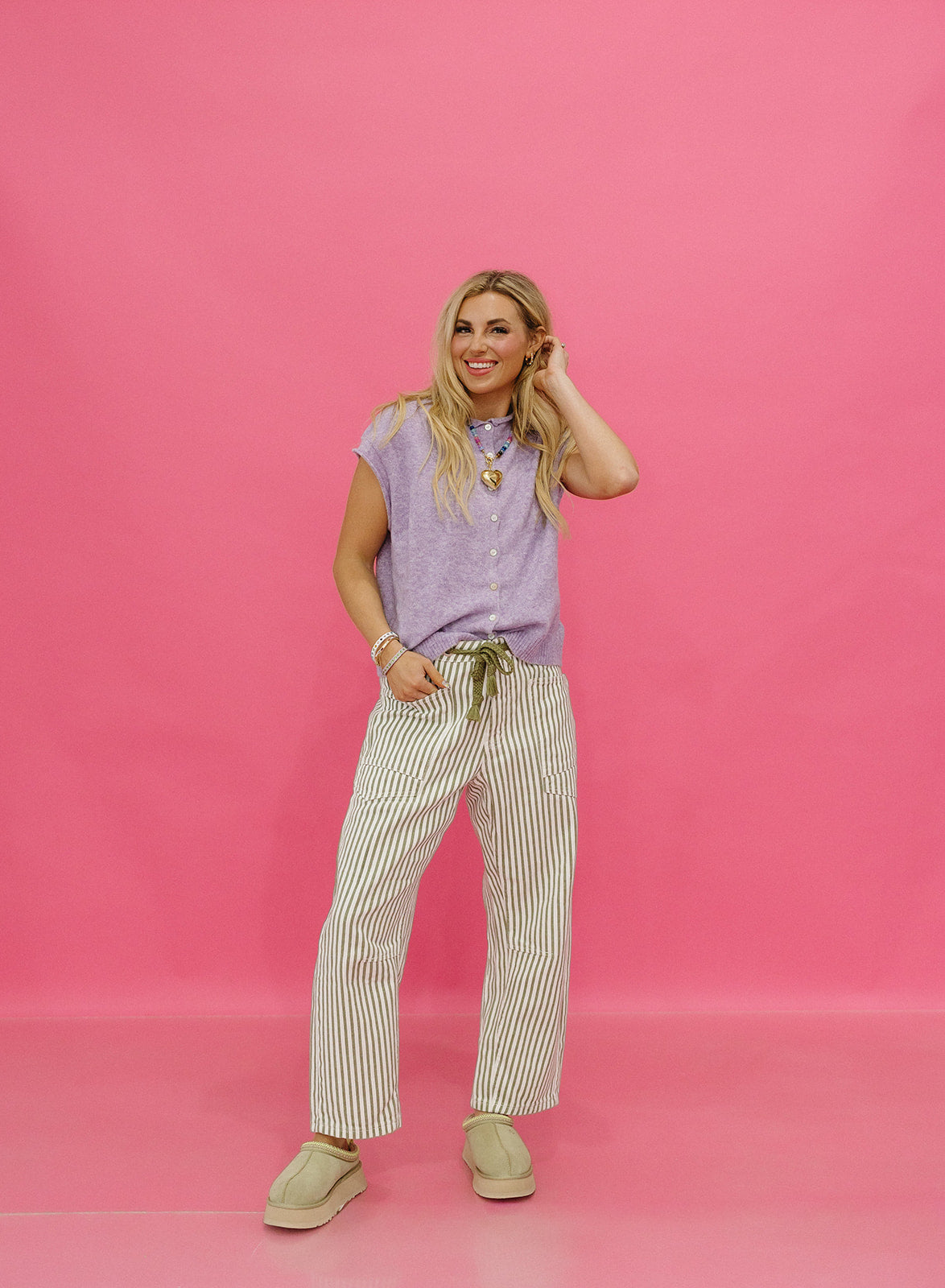 Your new spring layering essential. The Sleeveless Piper Cardigan in classic lavender features rolled cap sleeves, a full button-down front, and an oversized fit that works beautifully over everything. Wear it buttoned up as a top or open as a vest—this bestselling piece delivers versatility and effortless style in equal measure.
