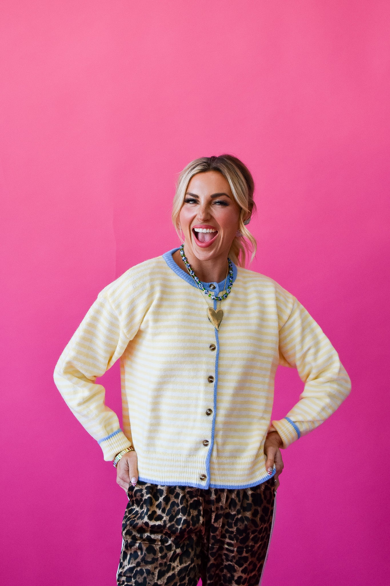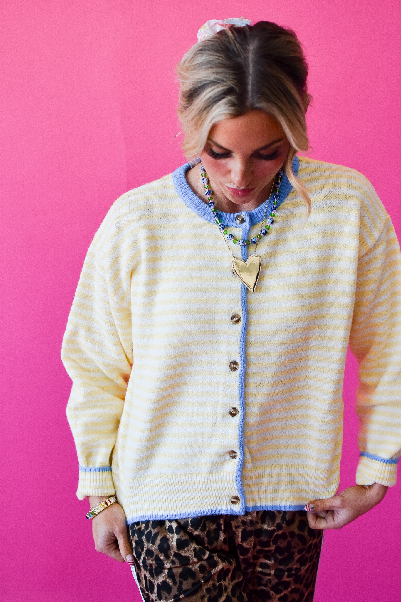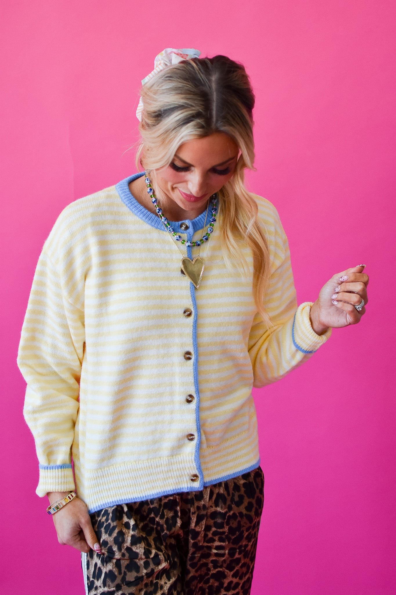 Add a burst of cheerful style to your wardrobe with the Brooks Stripe Cardigan. This sweet butter yellow knit features a playful cornflower blue trim and a relaxed fit that makes it perfect for layering. Pair it with your favorite jeans or camo pants to create a funky, fun look that's effortlessly cool and cozy all day long.