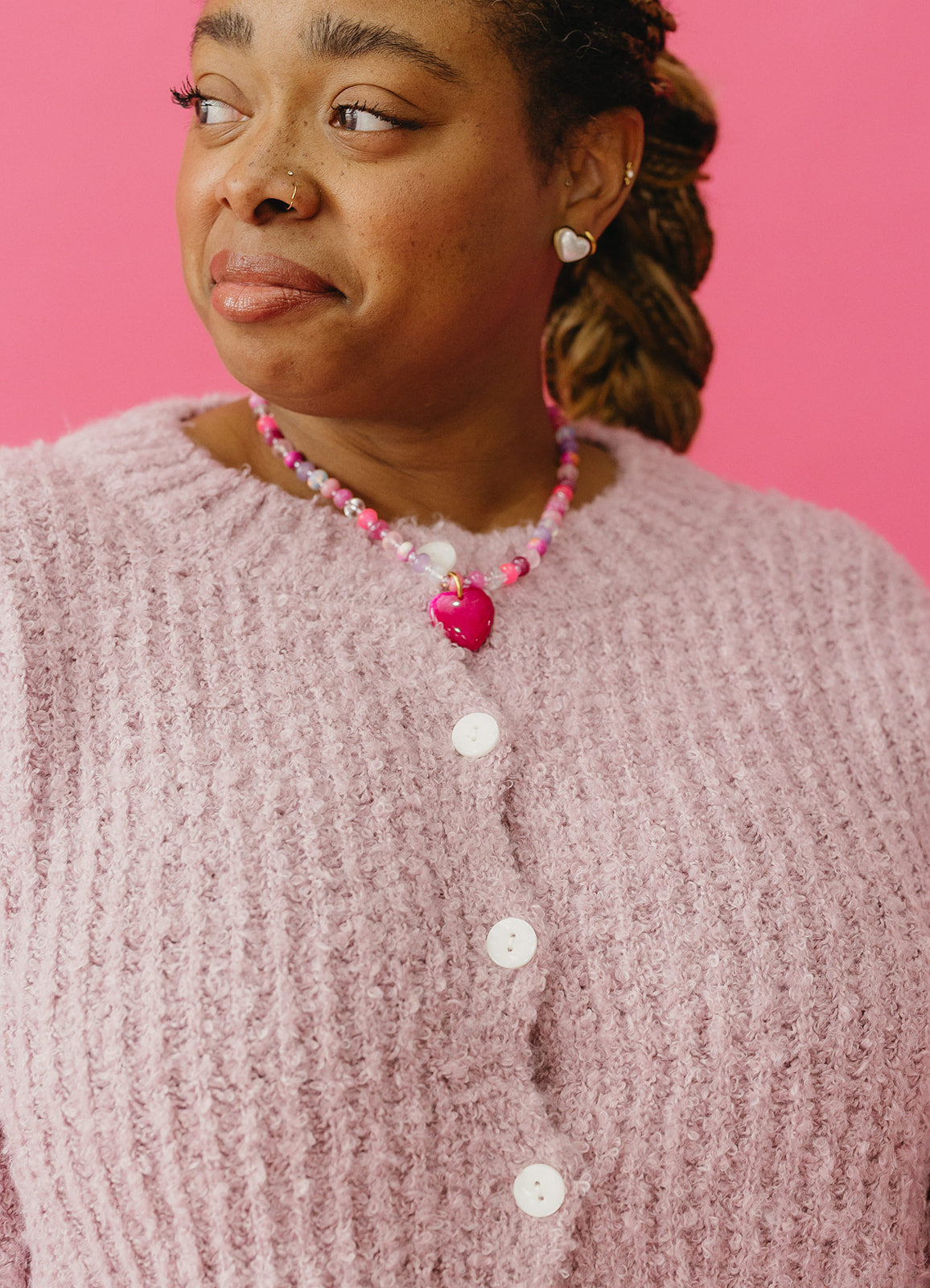 The Emerson Cardigan is your new go-to layer for any occasion. Crafted in the softest fabric, this mauve pink beauty features charming balloon sleeves and a slightly cropped silhouette that skims your frame without clinging. The relaxed fit makes it effortlessly chic—throw it on for date night or girls' night out, then transition it seamlessly into spring styling. Cozy enough for winter, versatile enough for year-round wear.