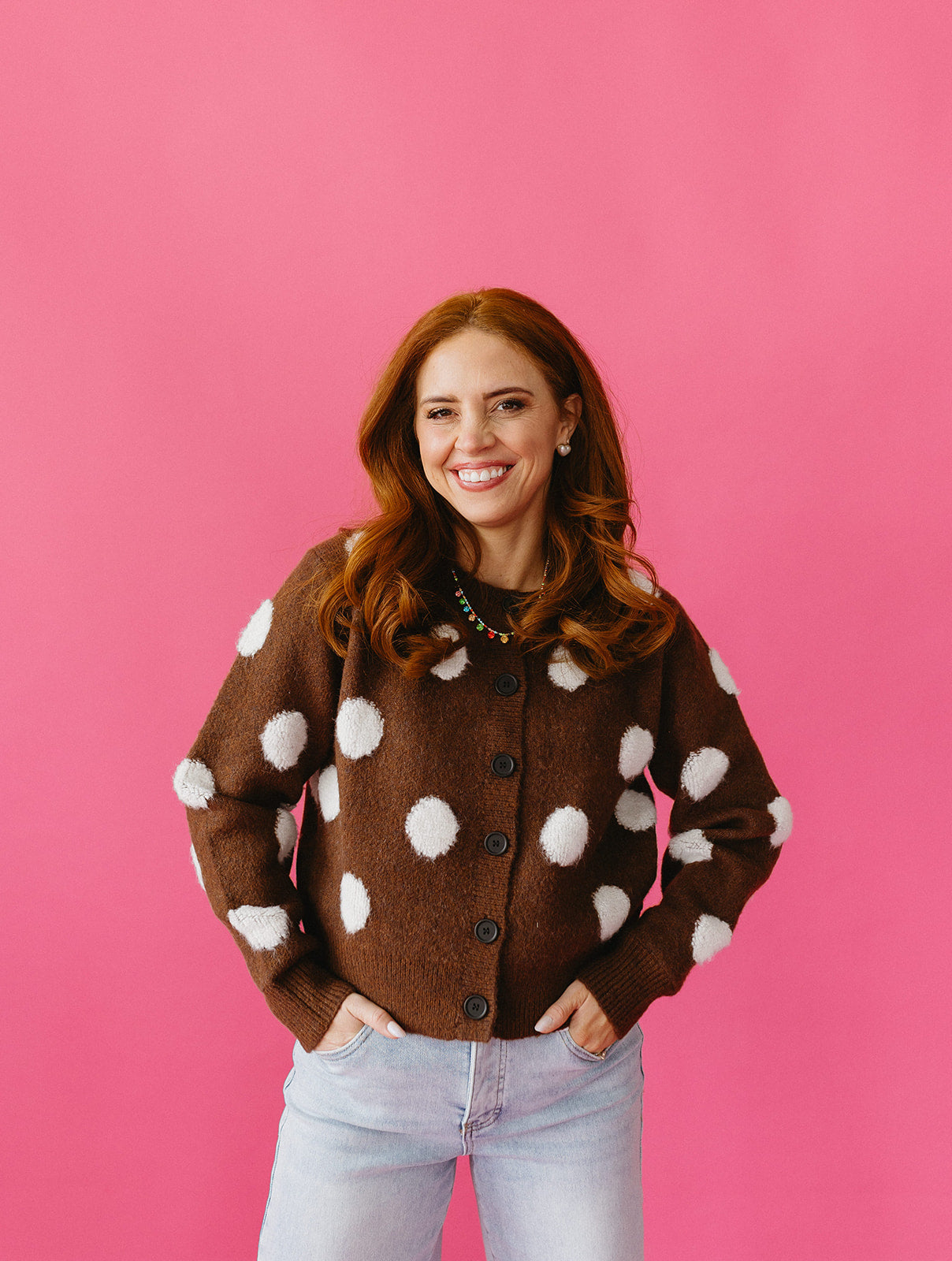 Wrap yourself in cozy charm with the Reagan Fuzzy Polka Dot Cardigan! This delightfully playful piece features a plush fuzzy knit that's irresistibly soft against your skin. The rich chocolate brown base is dotted with cheerful white polka dots for a fun, retro-inspired look. Functional buttons make layering effortless, while the substantial weight keeps you toasty warm through chilly winter days. Perfect for adding personality and comfort to your seasonal wardrobe.