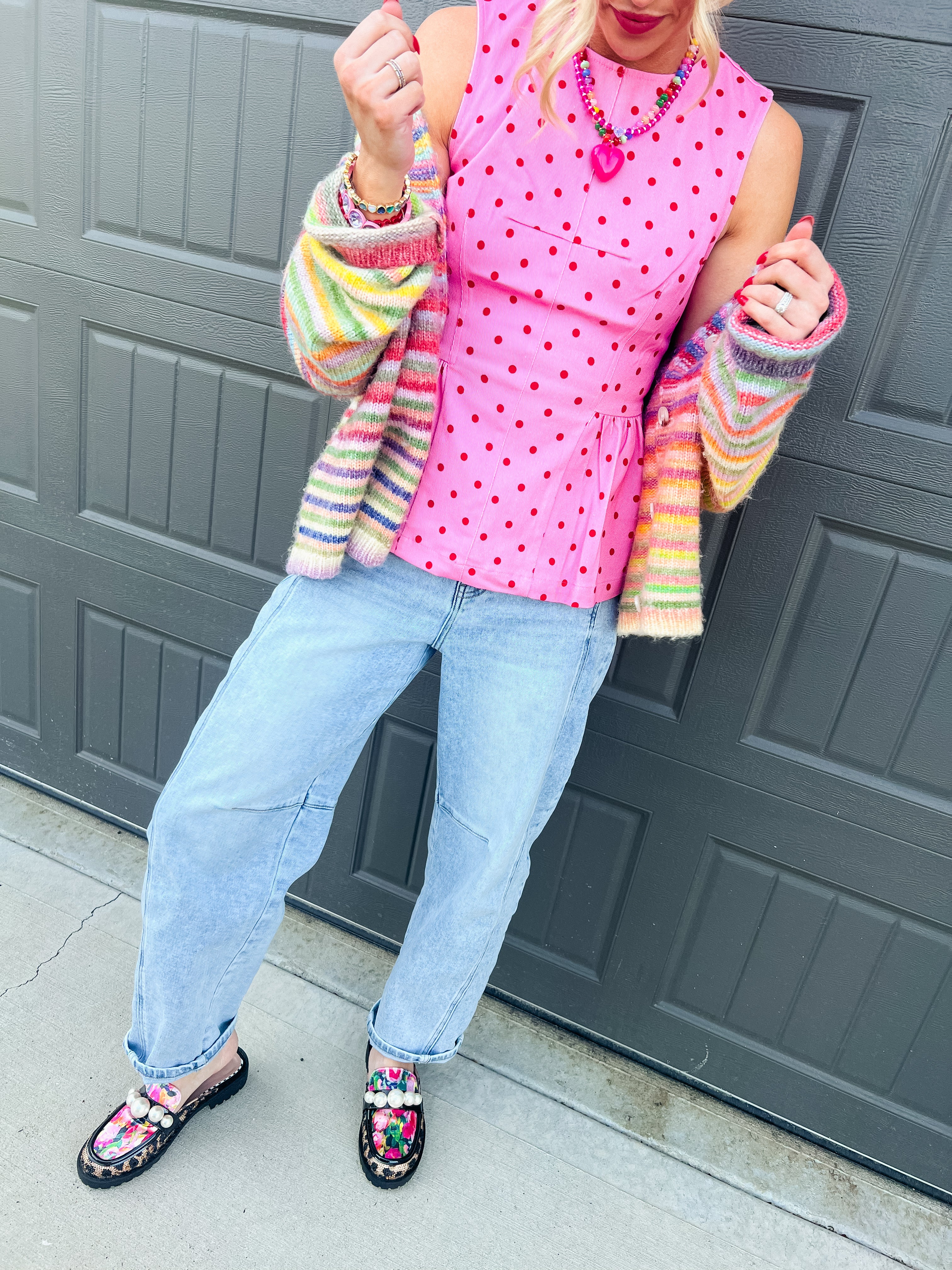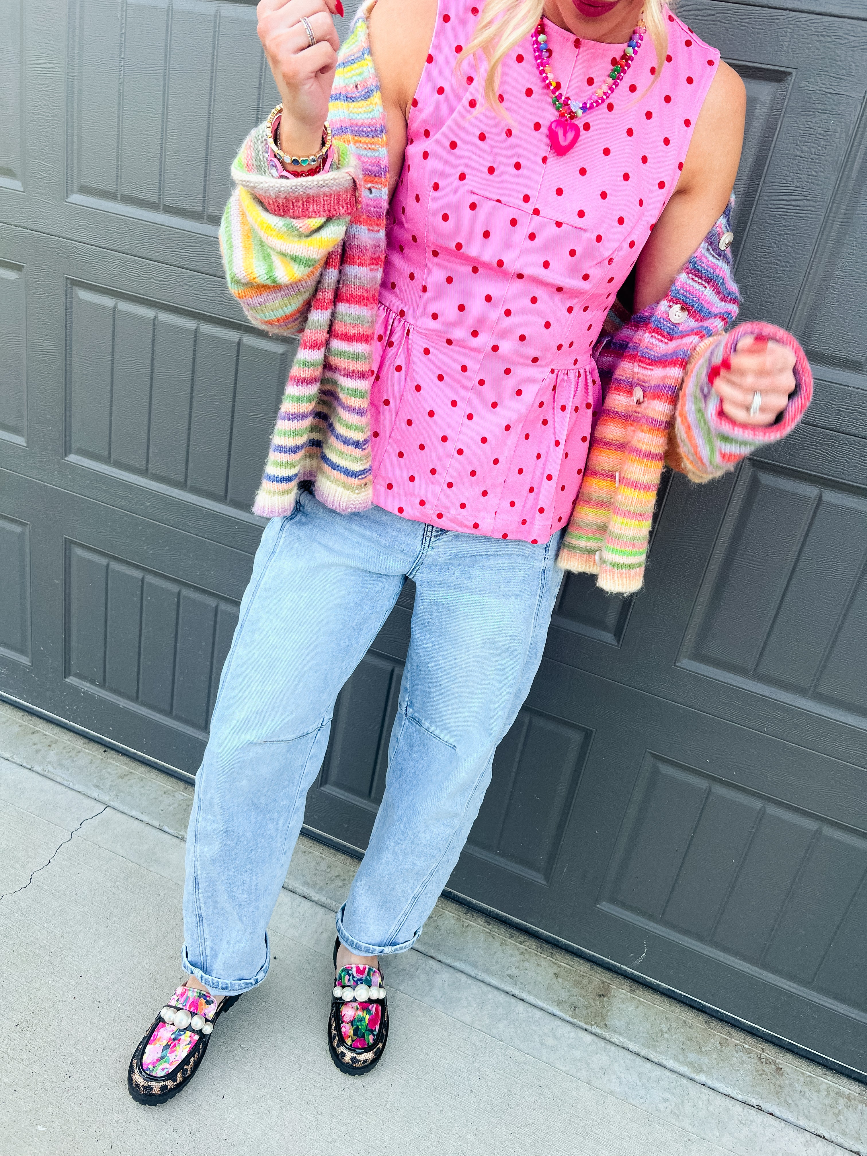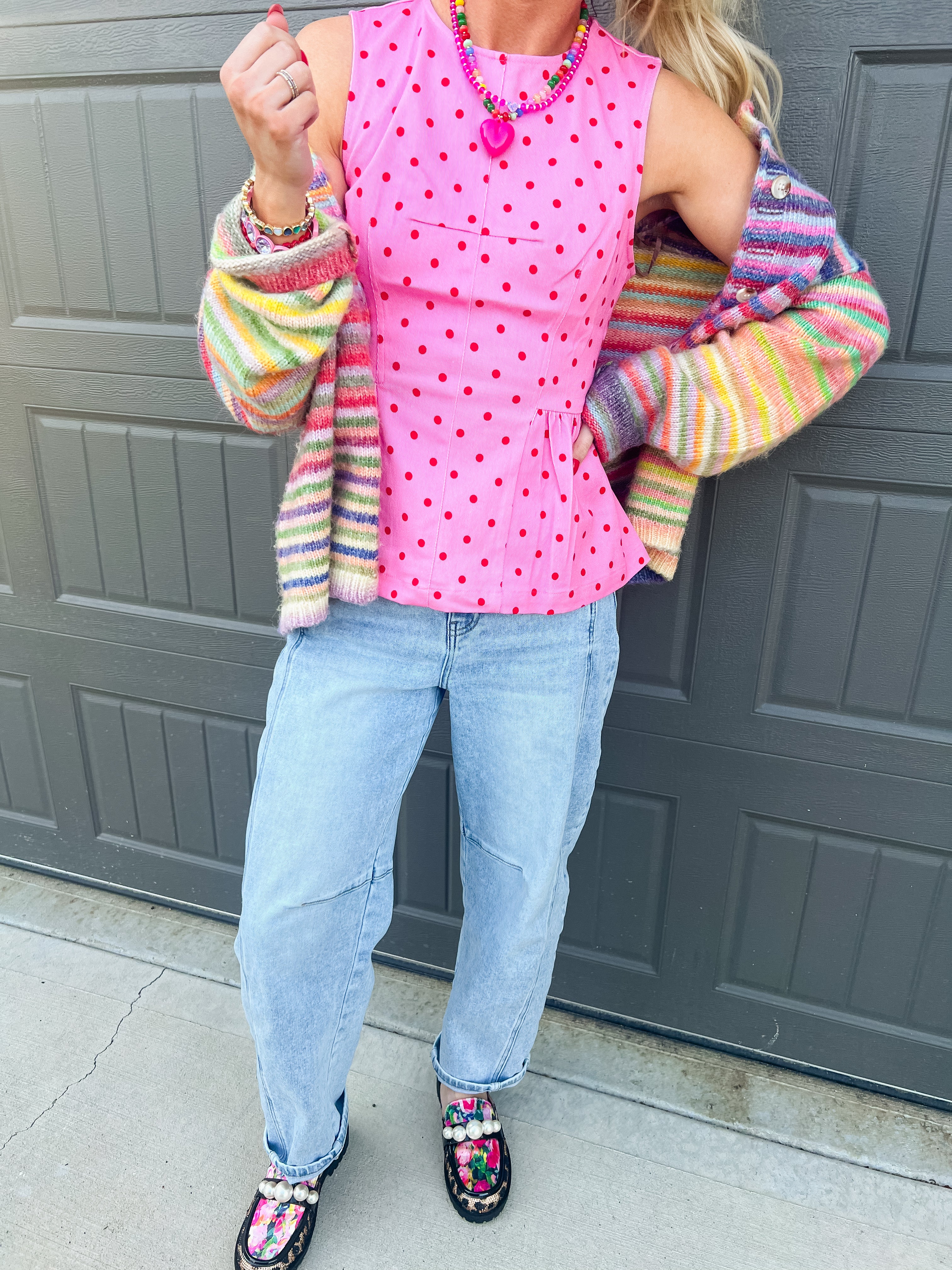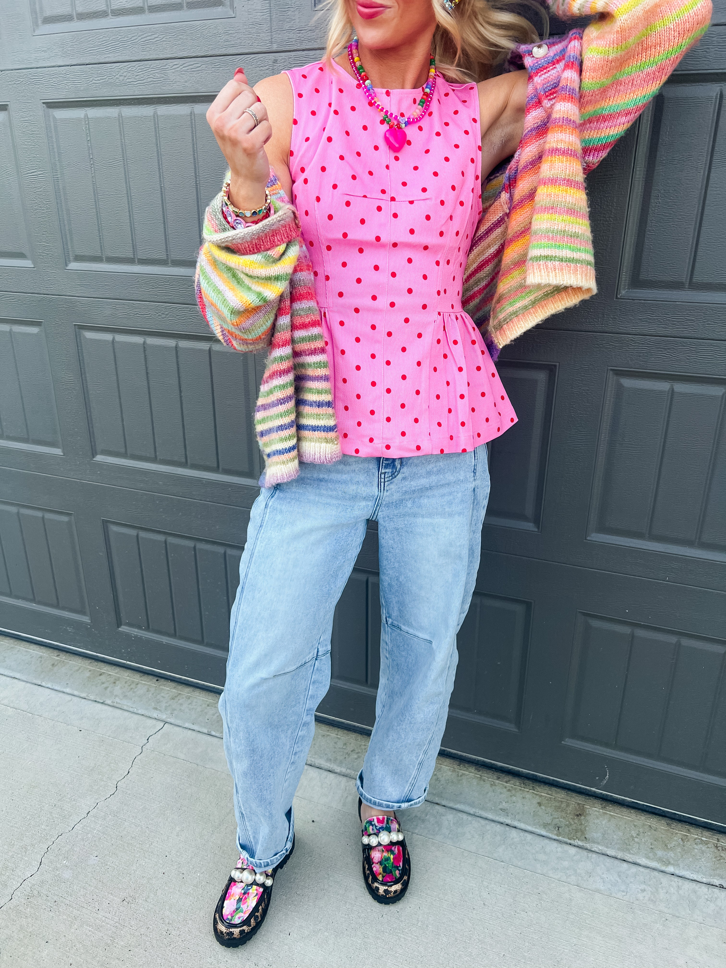 Strut your stuff in this adorable pink peplum top that's bursting with retro charm! Featuring bold red polka dots and a convenient back zipper, this stretchy number hugs you in all the right places while giving you that fun, flirty silhouette. Perfect for date night, brunch with the girls, or whenever you want to turn heads. The flexible fabric moves with you, so you can dance, twirl, and celebrate without missing a beat. A playful wardrobe essential that proves polka dots never go out of style!