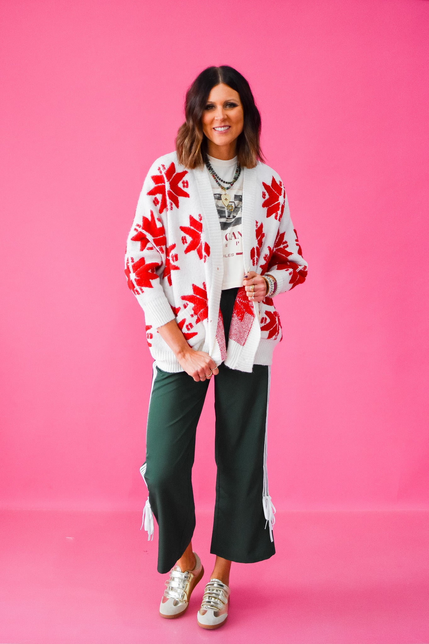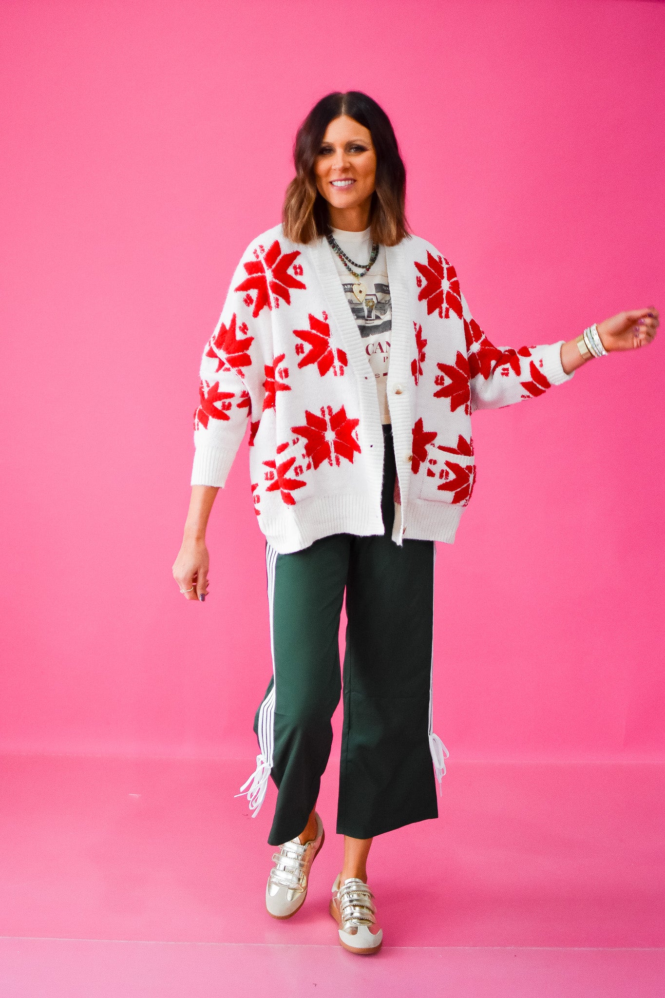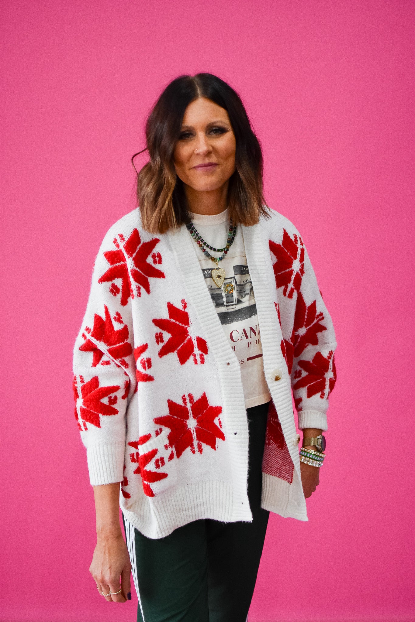 Stay snug and festive with the Taryn Snowflake Cardigan. This oversized ivory sweater is sprinkled with charming red snowflakes and fastens with easy button-ups. Perfect for cozying up on chilly days, it blends playful holiday spirit with ultimate comfort. Whether you're relaxing at home or out for winter fun, this cardigan keeps you warm and stylish in one charming package.