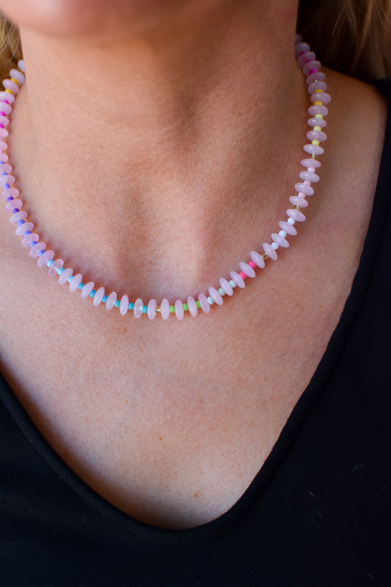 Add a pop of playful charm to any outfit with the Maren Necklace. Featuring light pink and colorful seed beads, this layered piece brings vibrant fun to your look. The magnetic clasp makes it easy to wear, while the extender chain ensures a perfect fit every time. Perfect for mixing, matching, and adding a delightful touch to your style.