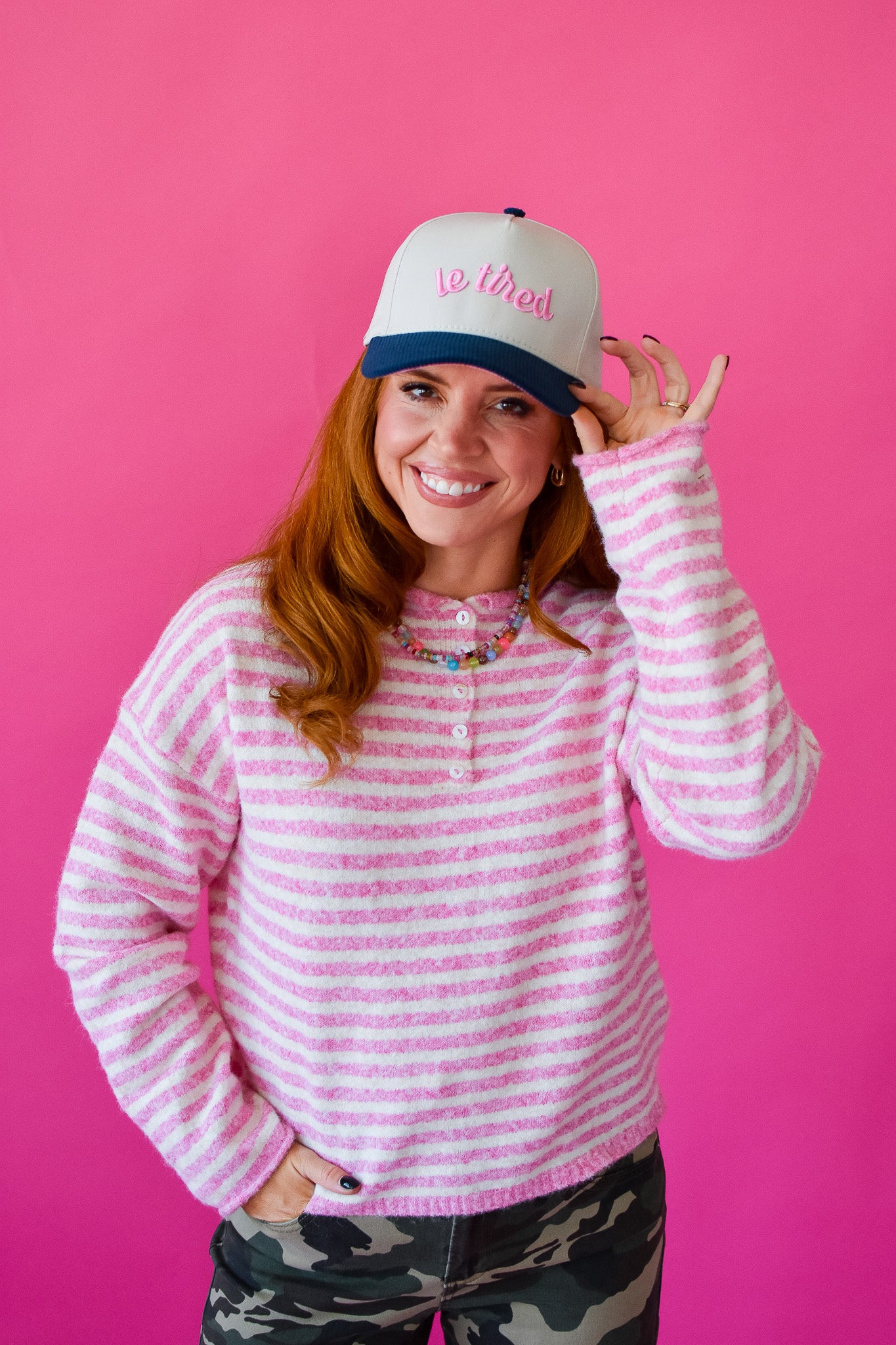 Stay stylish and cozy with the Le Tired Trucker Hat, featuring a soft navy and cream corduroy design. The adorable embroidered "le tired" adds a fun, laid-back vibe perfect for casual days. Its comfortable fit makes it your go-to hat for effortless, playful charm.