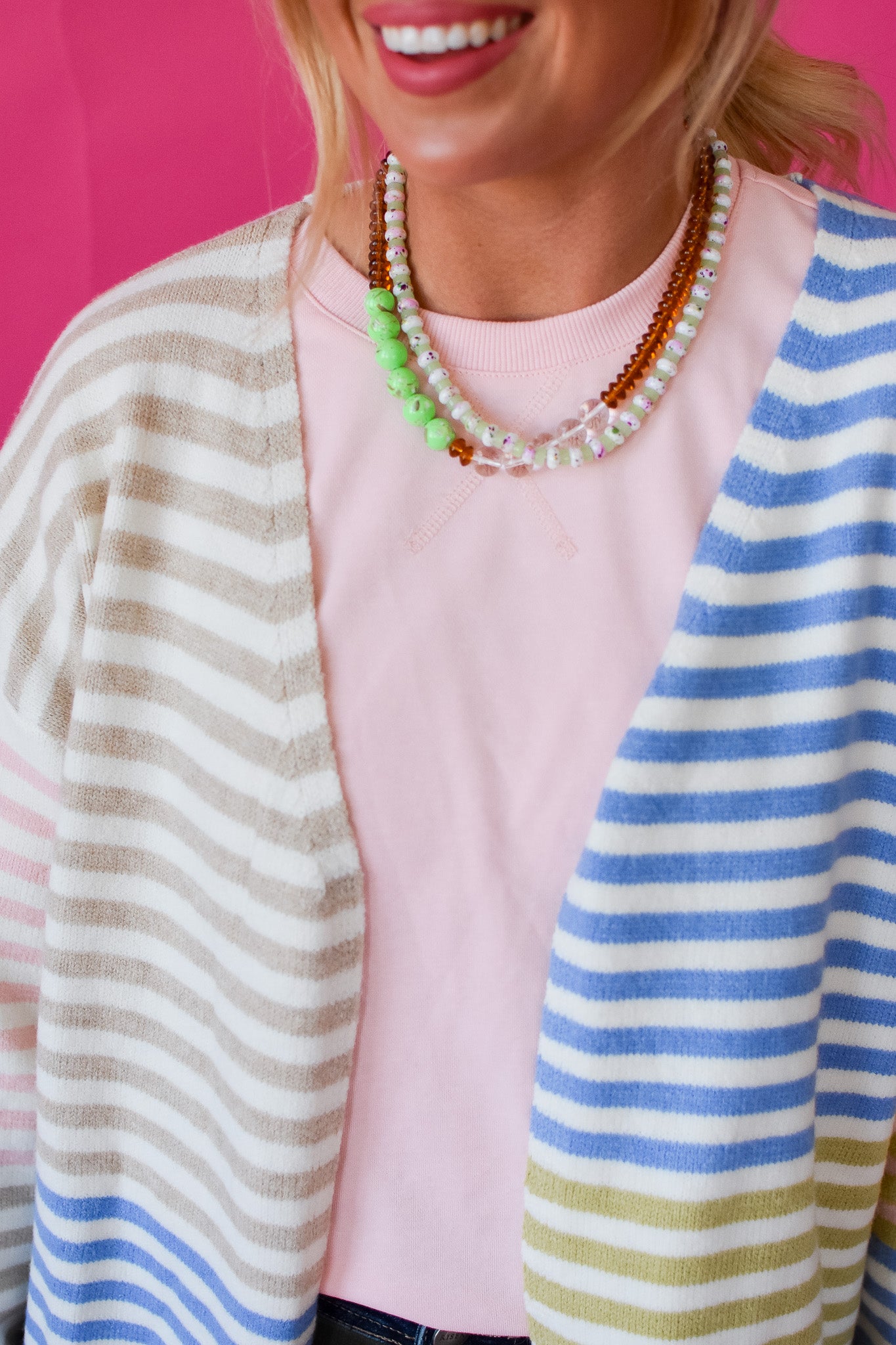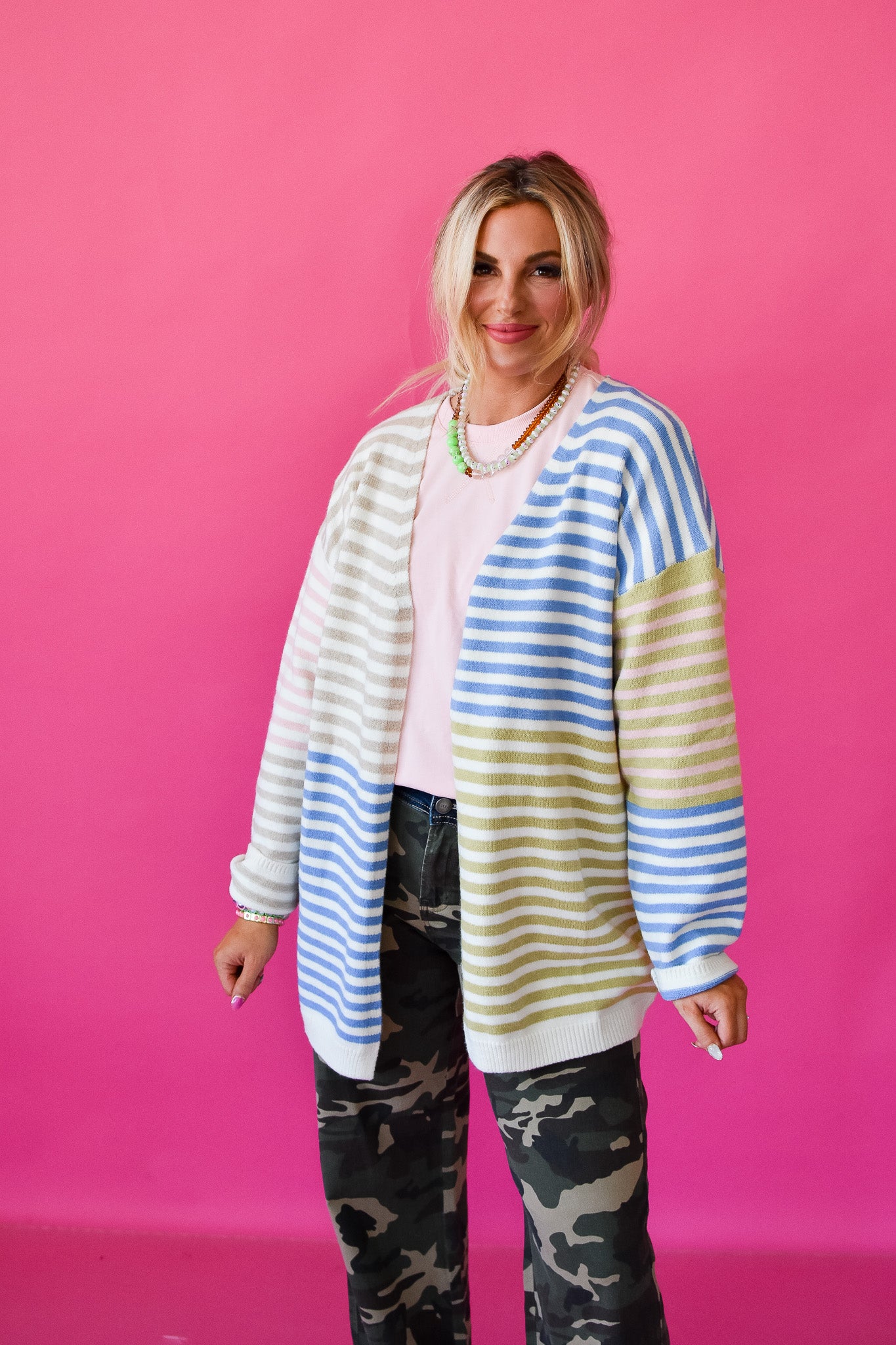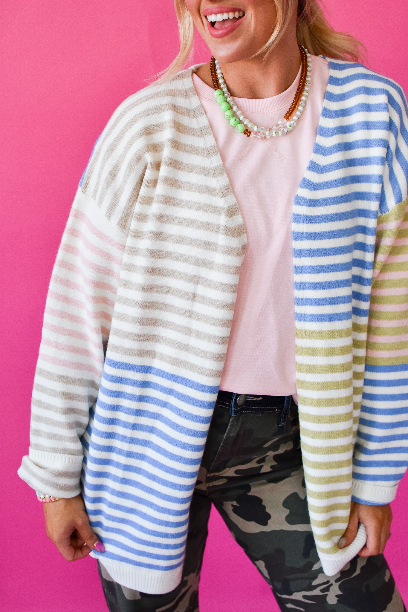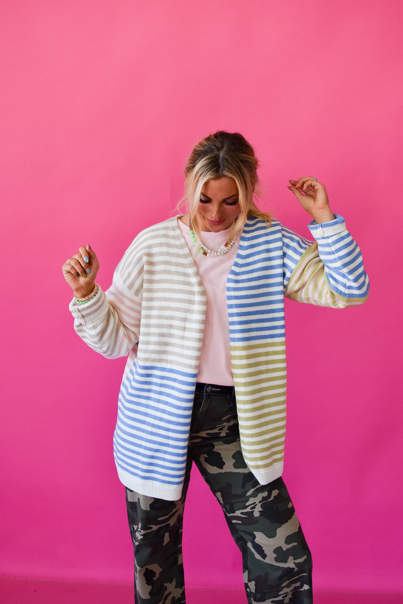 Wrap yourself in cozy color with the Lyssa Stripe Cardigan. Featuring playful stripes in taupe, light pink, chartreuse, and blue, this oversized knit is irresistibly soft and perfect for layering. Effortlessly stylish and comfy, it’s your new go-to for adding a cheerful pop to any outfit.