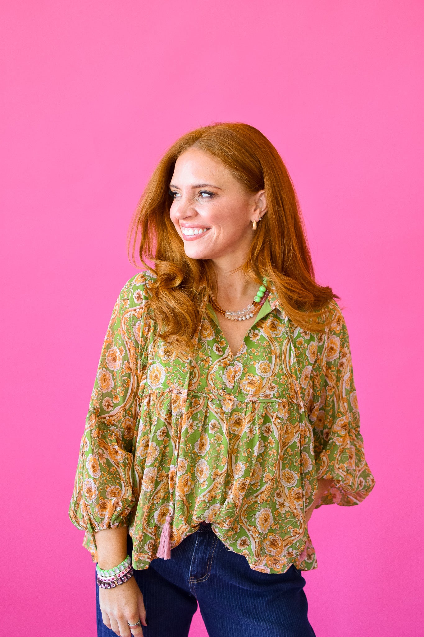 The Odie Floral Babydoll Top brings a playful, feminine touch with its charming olive floral pattern. Its airy, babydoll silhouette pairs beautifully with dark denim, creating an effortlessly cute and casual look perfect for sunny days or relaxed outings. Light, flirty, and fun—this top brightens your wardrobe with ease.