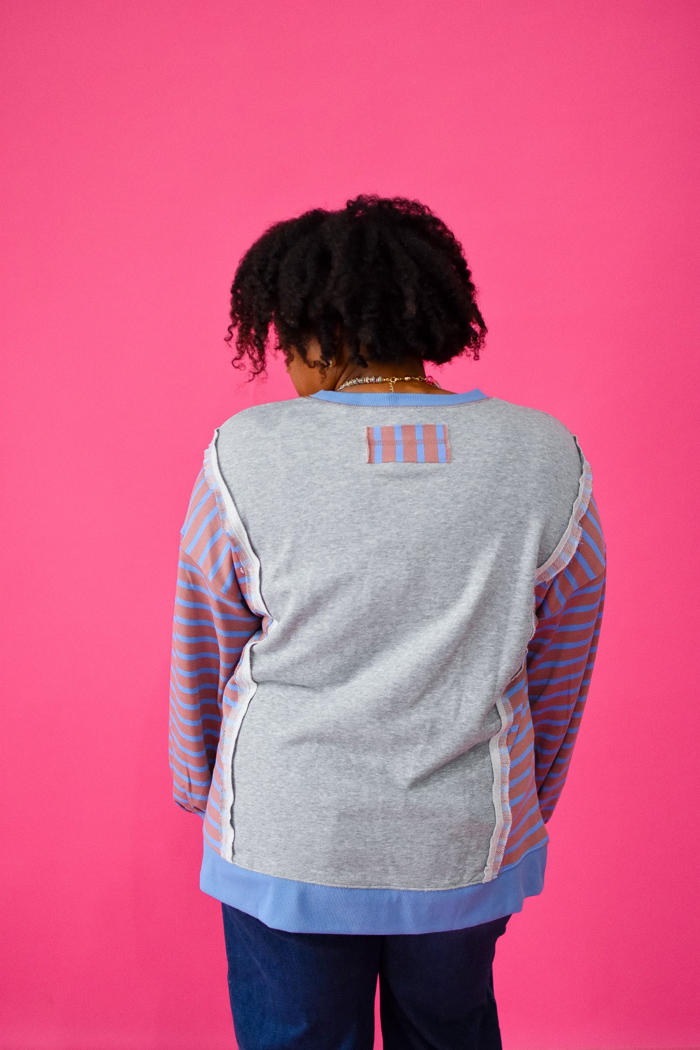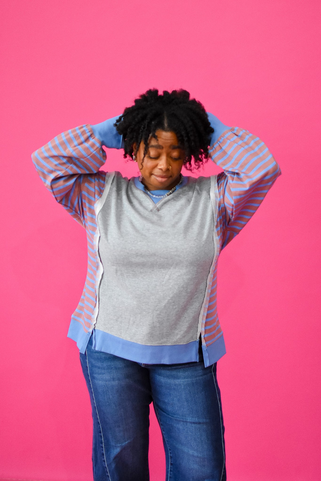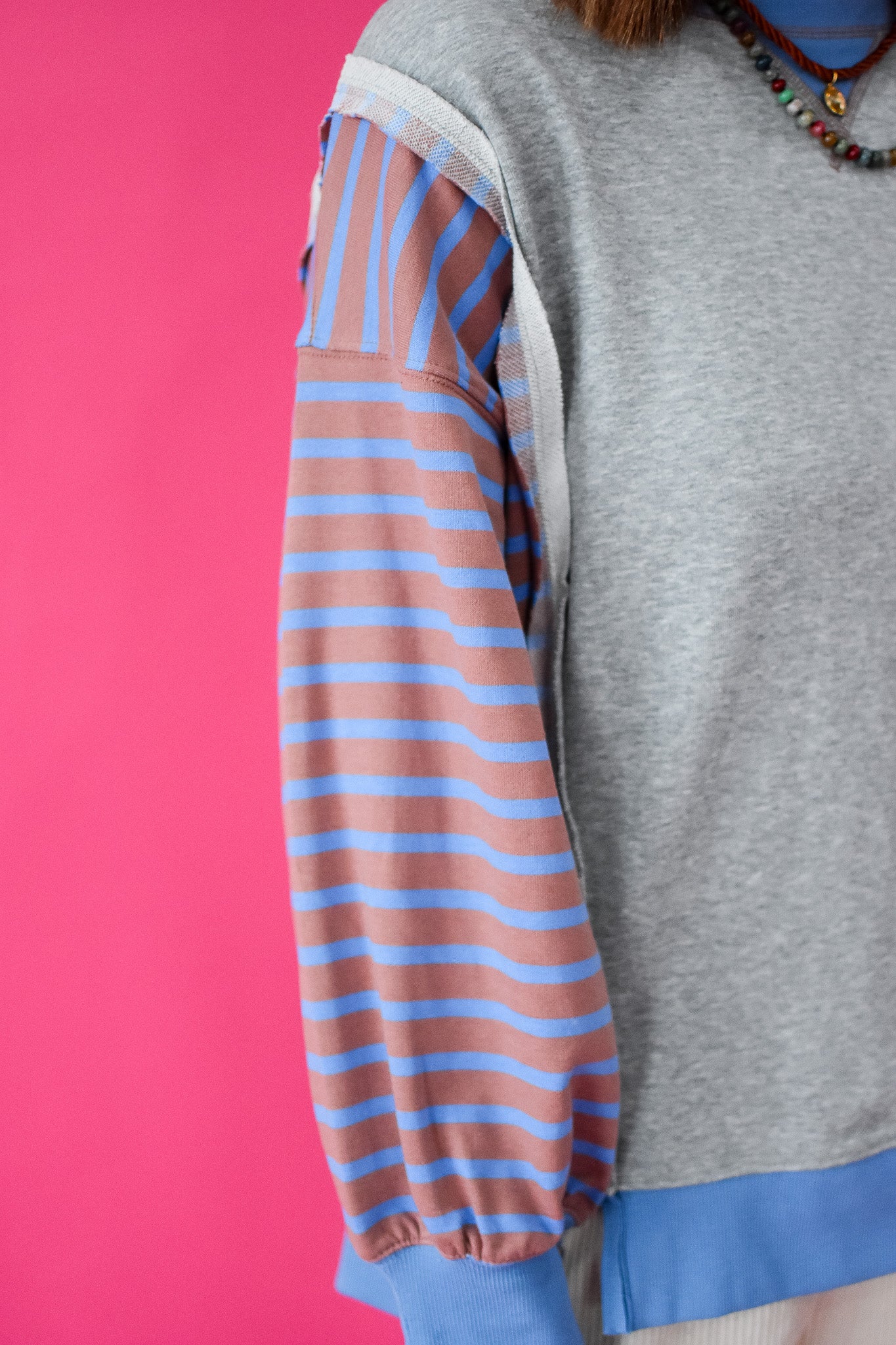 The Darby Sweatshirt is your new go-to for effortless style and maximum coziness. This oversized beauty features a soft grey body with eye-catching brown and blue striped sleeves that add just the right amount of personality. Cut in a flattering French style, it's designed to drape beautifully while keeping you wrapped in comfort. Perfect for lazy days, casual outings, or whenever you want to look put-together without trying too hard.