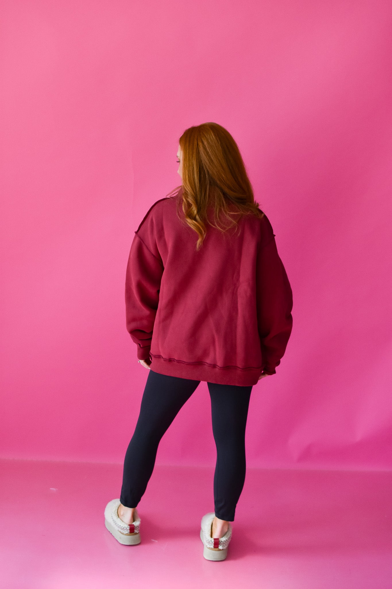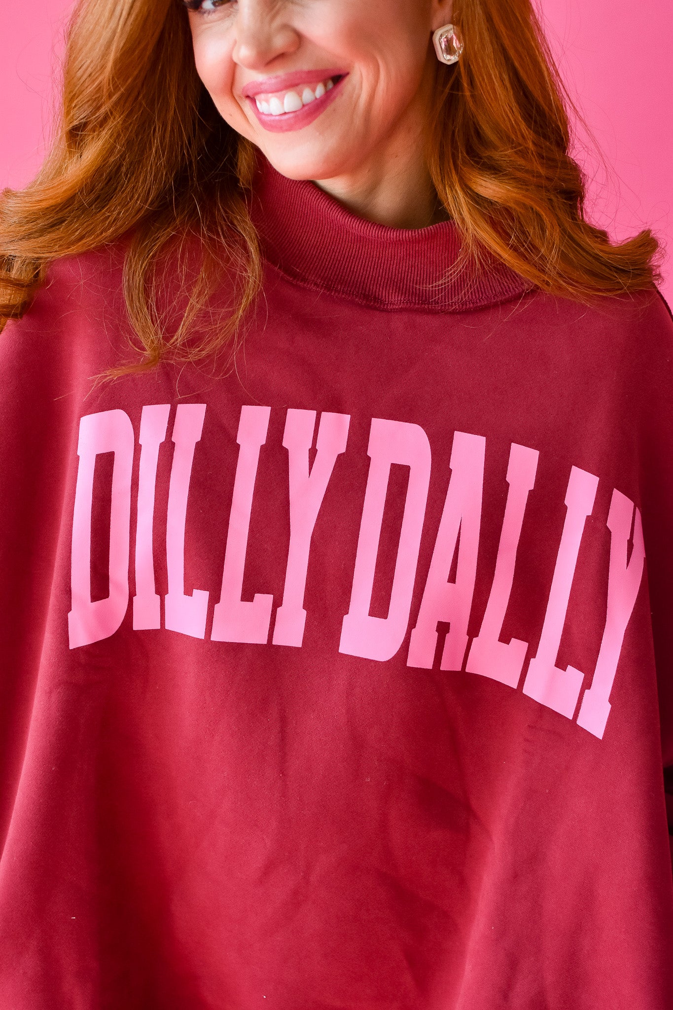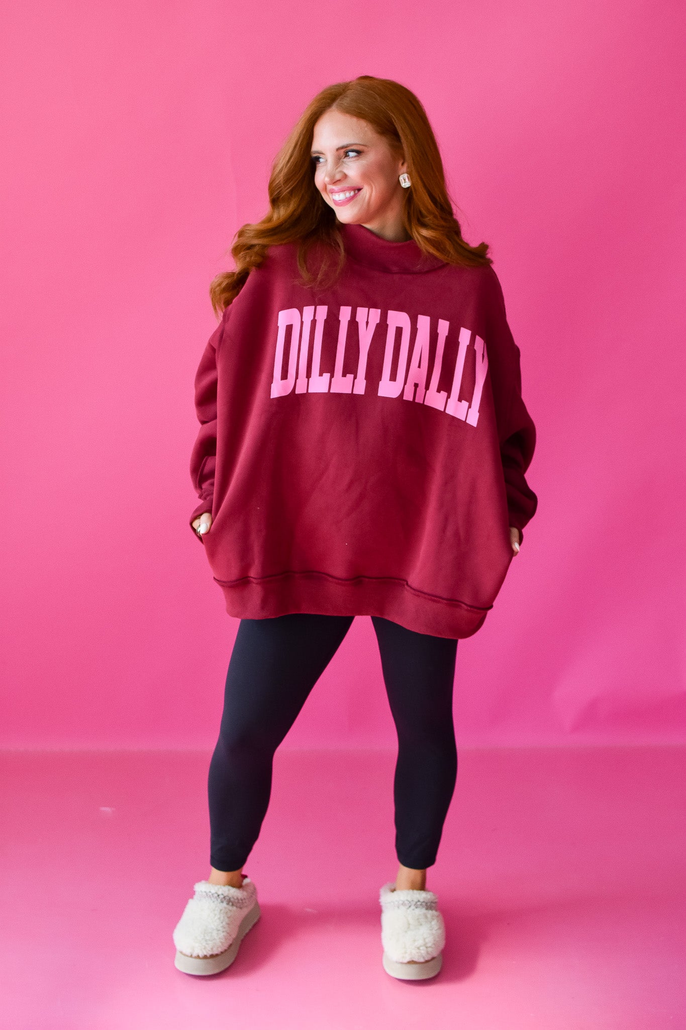 Embrace laid-back vibes with this burgundy oversized mock neck sweatshirt featuring playful hot pink "dilly dally" lettering. Extra cozy and roomy, it’s perfect for those moments when taking it slow is the only plan.