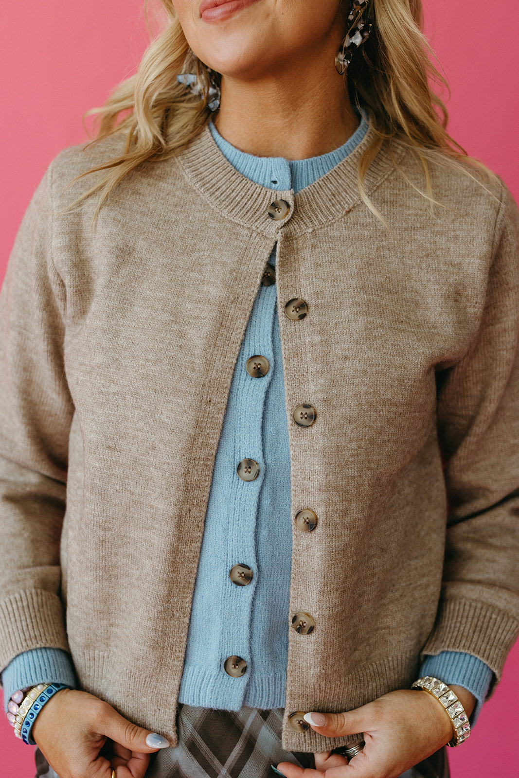 The Emery Layered Cardigan gives you all the cozy, dimensional vibes of a perfectly styled outfit—minus the closet space crisis. This faux layered beauty in mocha and light blue creates that effortless "I woke up like this" aesthetic without actually wrestling into multiple pieces. Slip it on for instant depth and visual interest that makes getting dressed feel like a breeze. Perfect for anyone who loves the look of layering but prefers keeping things refreshingly simple.