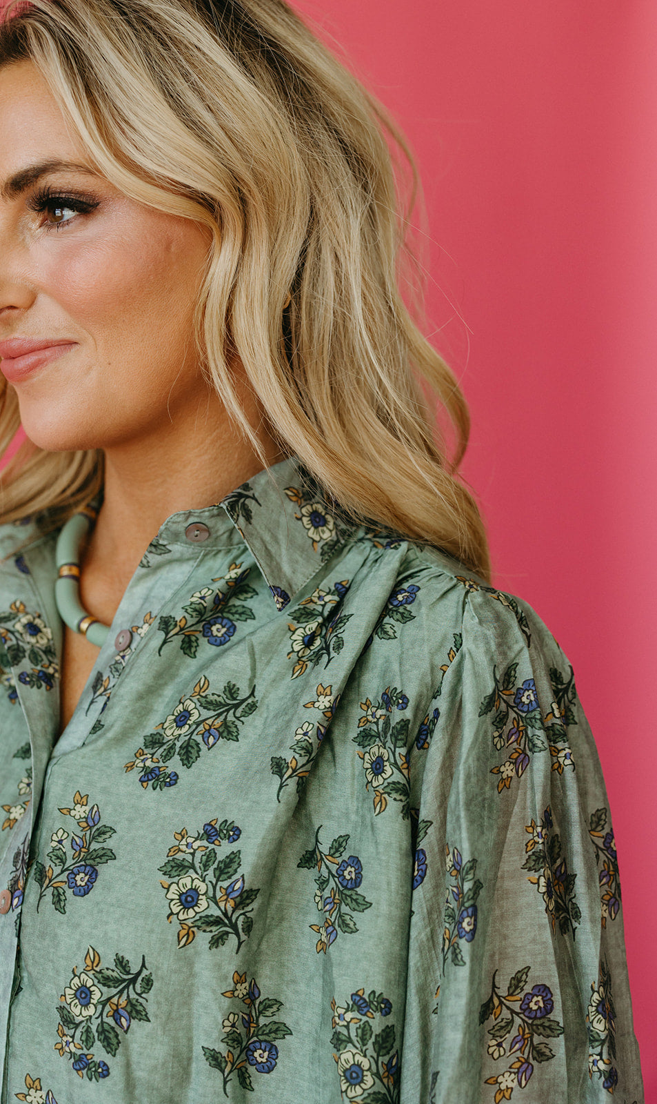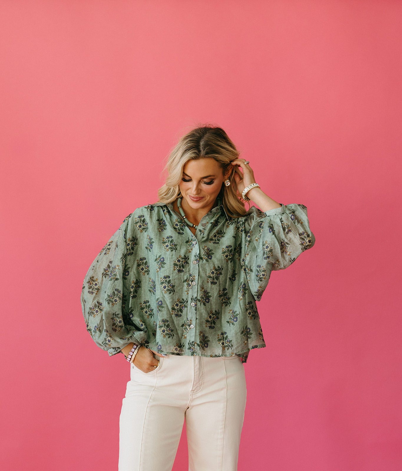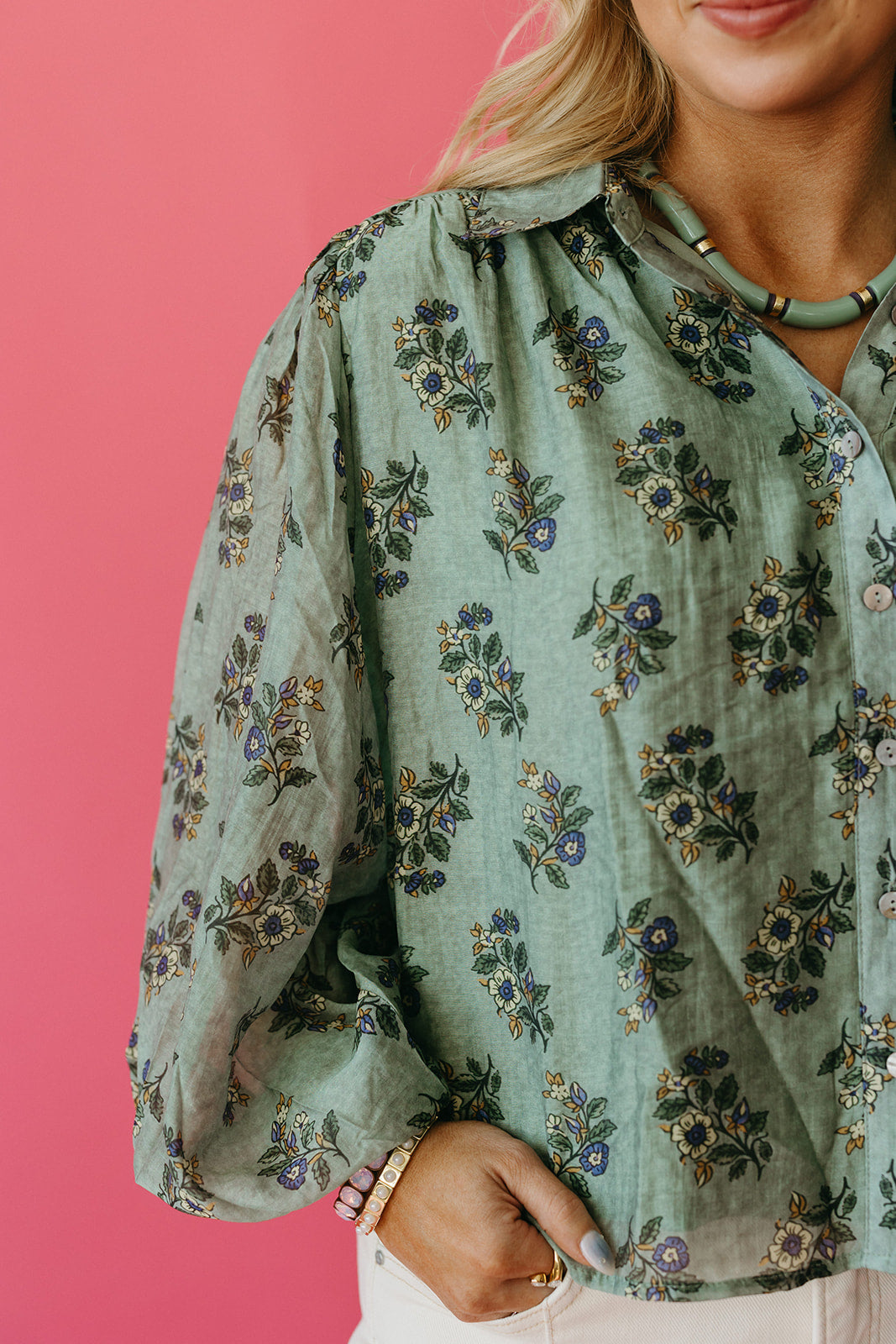The Janessa Floral Top in soft sage green brightens your wardrobe with delicate blooms and easy button-up style. Perfectly paired with creamy ivory pants or your favorite denim, it adds a fresh, playful vibe to any look. Whether you're out for brunch or a casual day, this top combines comfort and charm with effortless grace.