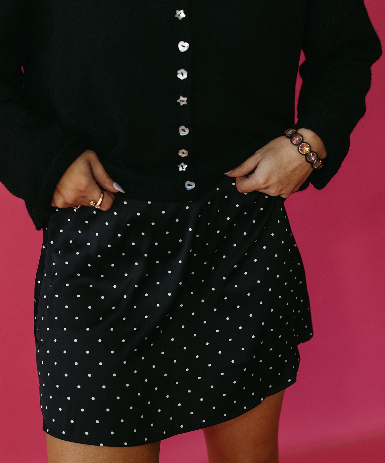 Meet your new go-to piece! This Julianna Polka Dot Skort combines classic black satin with charming white polka dots for instant style appeal. The elastic waist ensures all-day comfort, while the skort silhouette gives you the best of both worlds. Dress it up with a cozy sweater for cooler days or keep it casual with a graphic tee for weekend vibes. Versatile, fun, and endlessly wearable—this skort is ready for whatever your day brings!