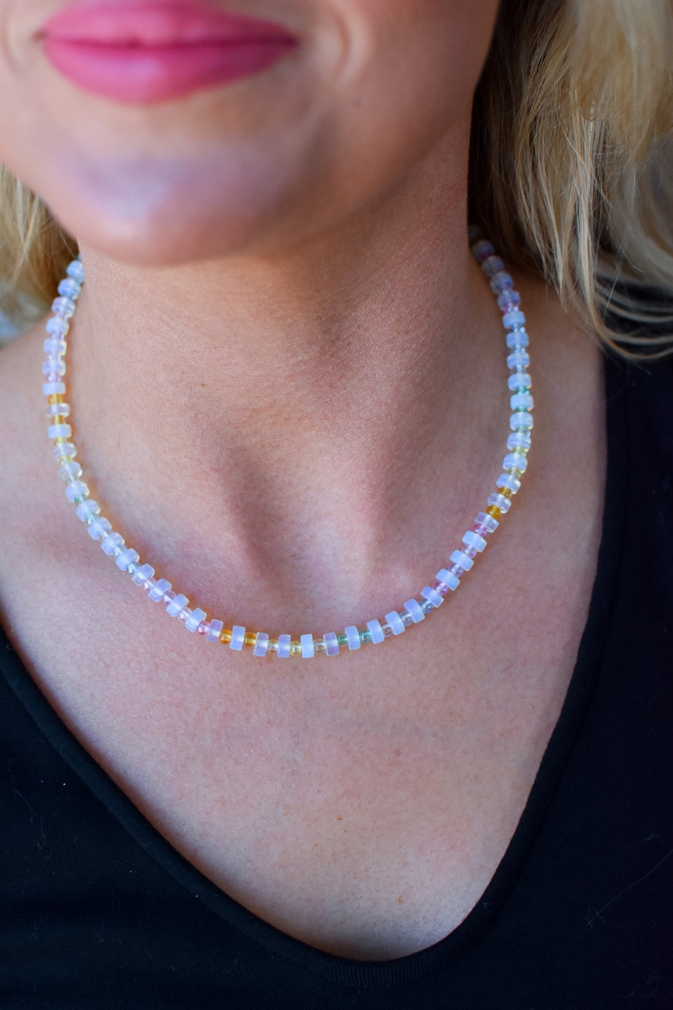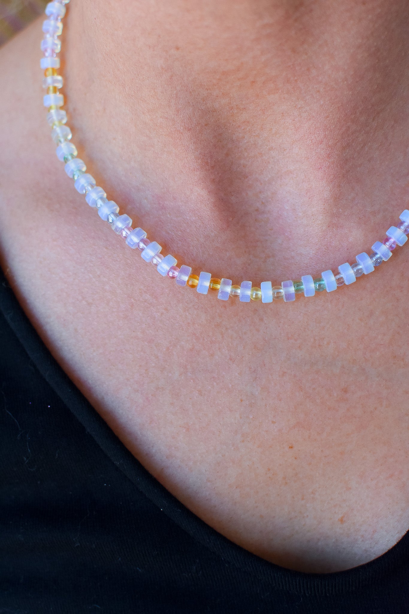 Add a splash of color and charm with the Maggie Necklace, featuring opal and vibrant seed beads strung together with a magnetic clasp for easy layering. Pair it with one of our other colorful necklaces to create your own playful, eye-catching combination that brightens any outfit. Perfect for mixing, matching, and making a statement!