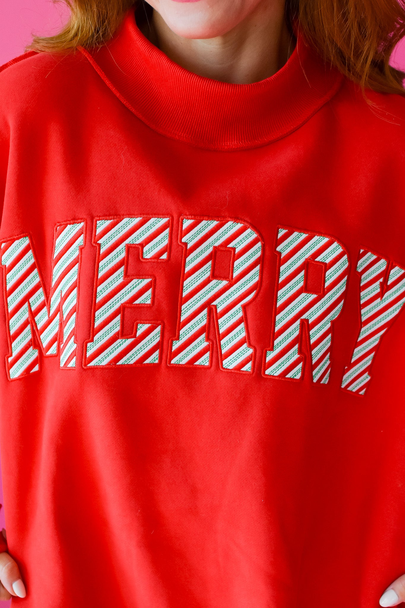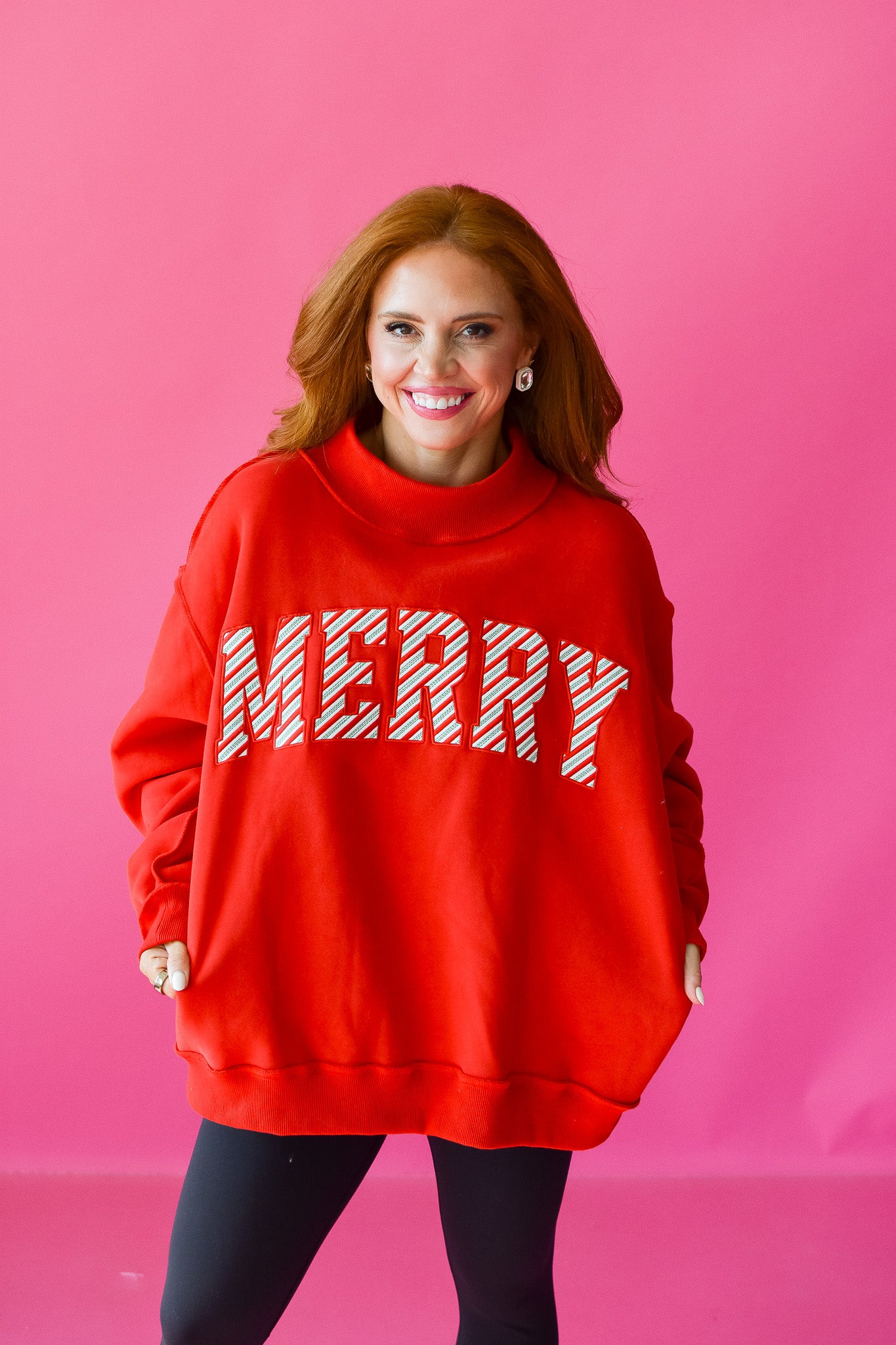 Get into the season’s spirit with this oversized cozy red mock neck sweatshirt featuring bold white and red embroidered letters. Perfect to pair with leggings or fun pants, it’s your go-to for playful comfort and style all season long.
