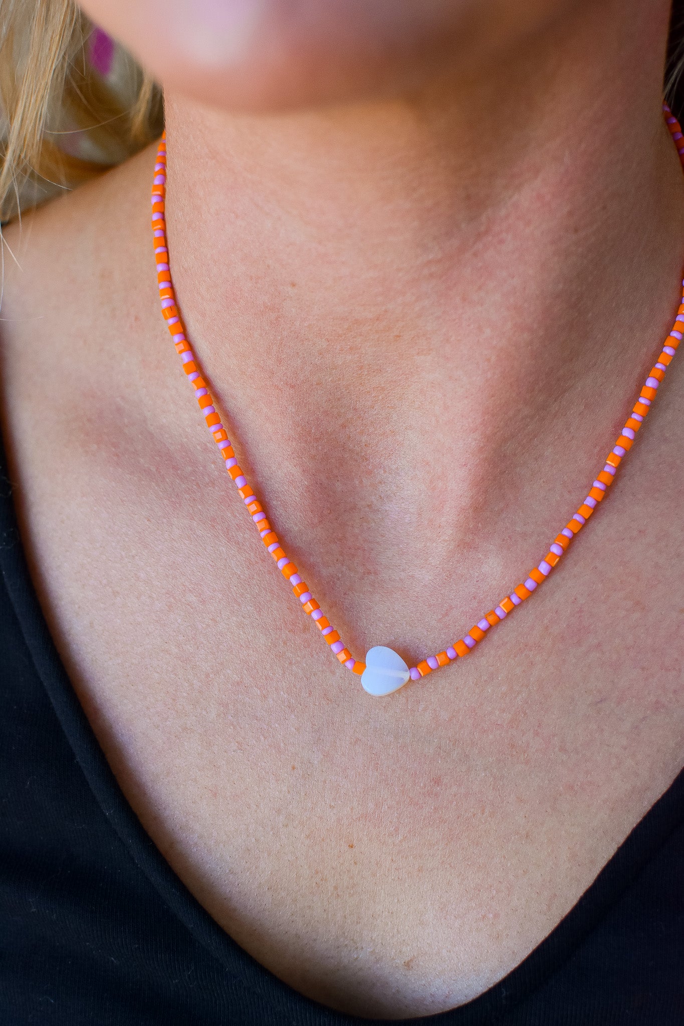 Add a pop of fun to your look with the Simone Necklace! Featuring cheerful orange and pink mini beads paired with a charming pearl white heart bead, this necklace brings a playful vibe to any outfit. The magnetic clasp makes it easy to wear and remove—perfect for those who love style with a dash of whimsy. Preorder now and get ready to brighten your day!