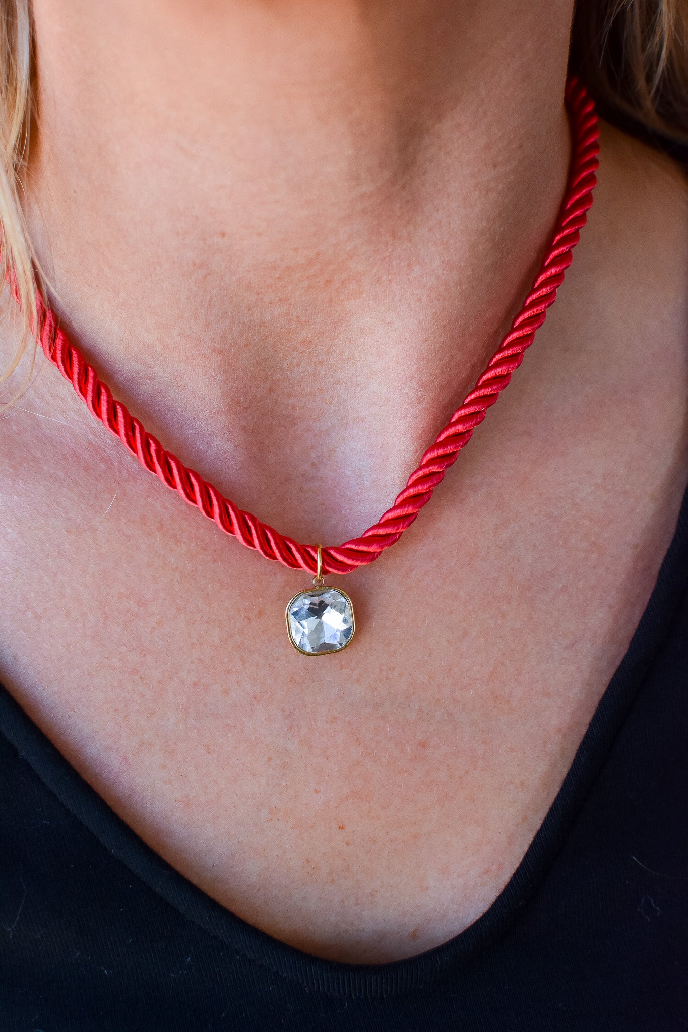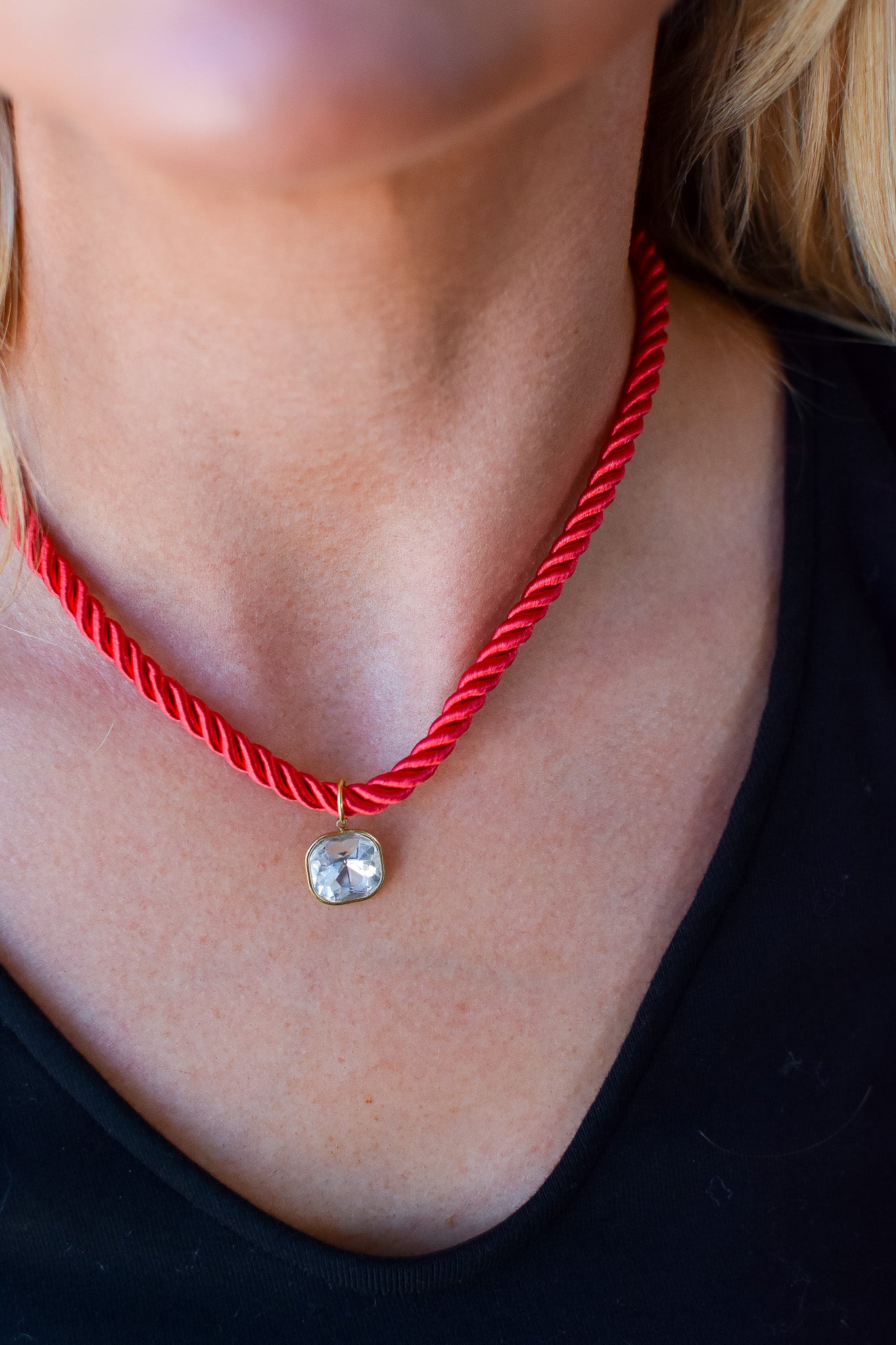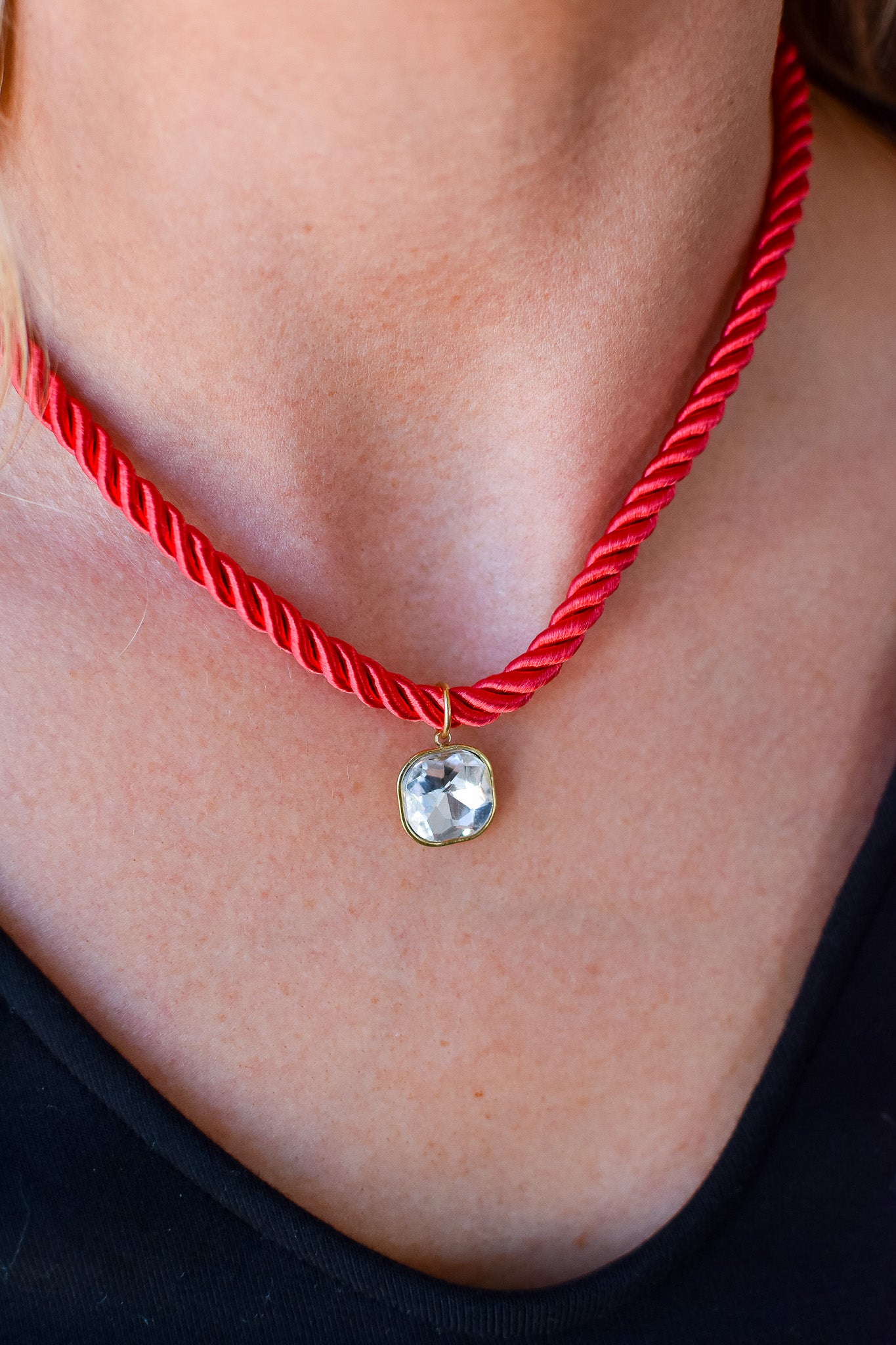The Tailyn Rope Necklace in Red pairs a rich, red rope with a sparkling rectangular crystal charm, creating a bold yet refined design. Measuring 15–18 inches with a 3-inch extender, this versatile piece is designed for layering or wearing solo. Its satin-finished cord provides a soft, elegant touch, while the gemstone charm adds just the right amount of sparkle.