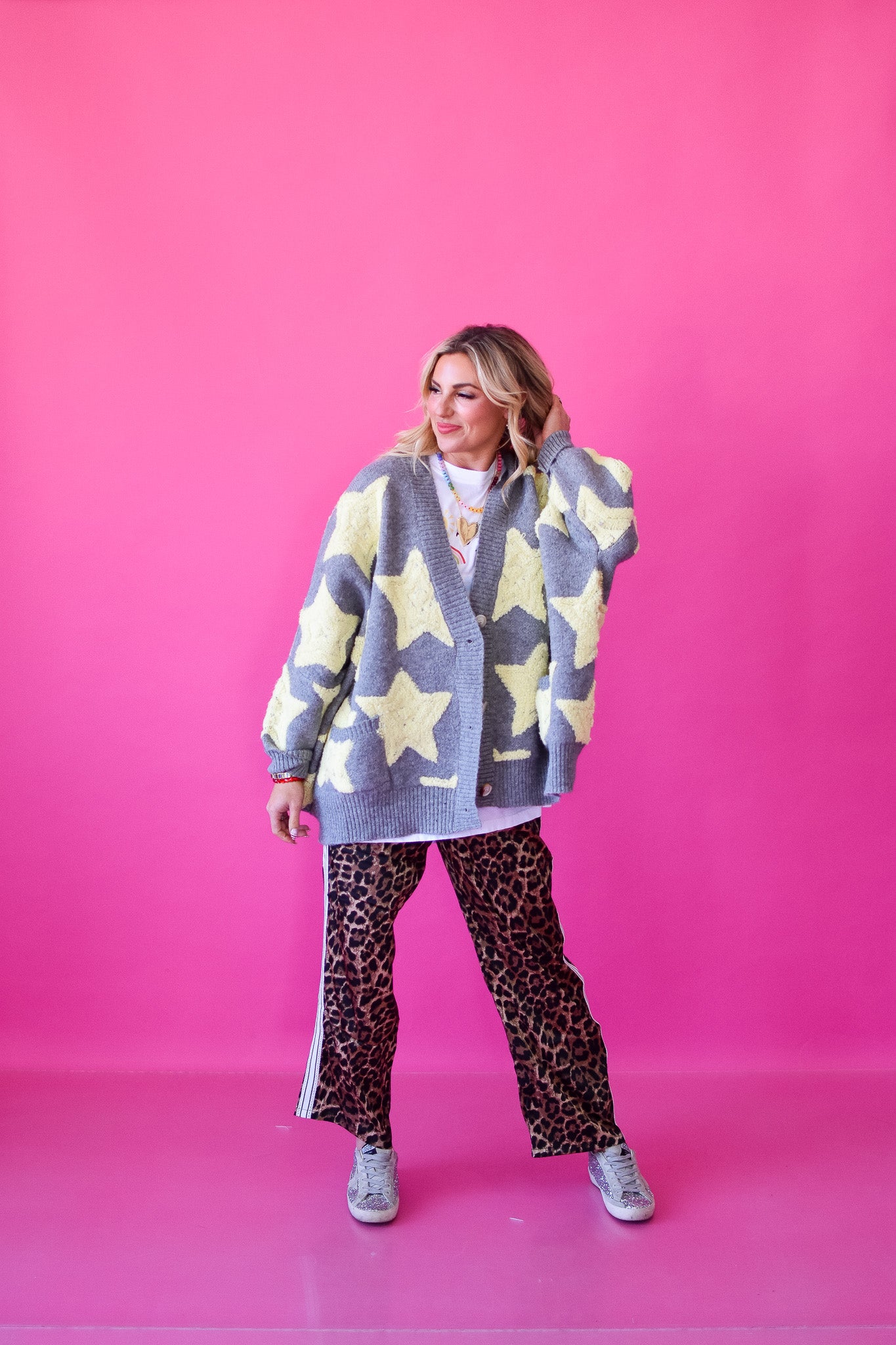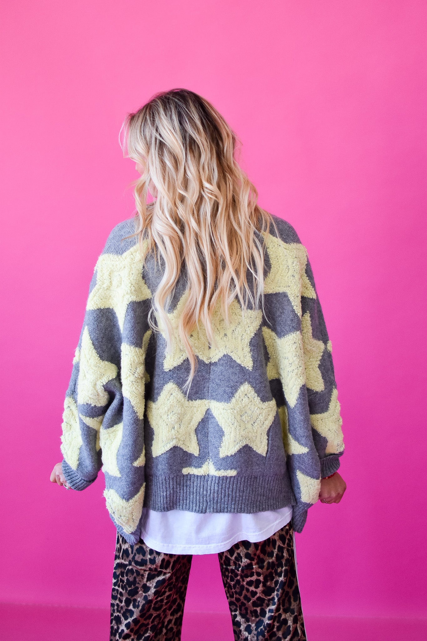 Meet your new favorite layering piece—the Taryn Star Cardigan. Oversized and impossibly cozy, this button-up cardigan pairs a soft grey base with cheerful butter yellow stars that instantly brighten any outfit. Throw it on over a simple tee, wear it solo, or style it however you want. It's the kind of cardigan that makes getting dressed feel fun and effortless.